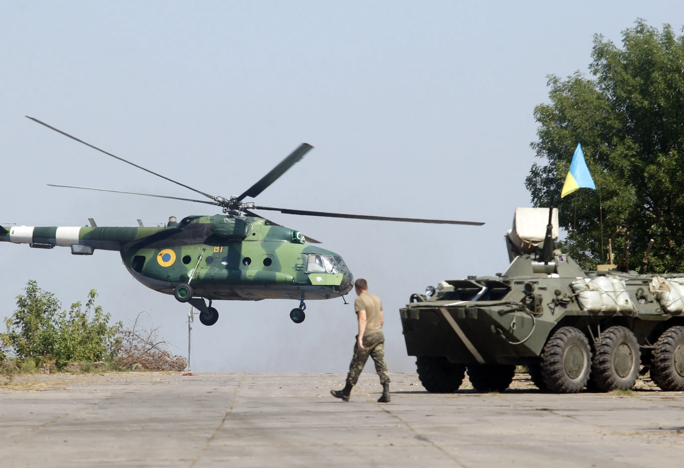 A serviceman walks near an APC while a helicopter flies on the position of the Ukrainian troops in Donetsk region on August 9, 2014. Fighting with pro-Russian separatists in eastern Ukraine has left 13 troops dead in the last 24 hours, Ukraine's military said Saturday. (Photo by Anatolii Stepanov/AFP Photo)