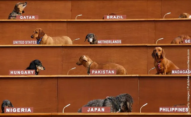 Dachshunds are seen during a performance and art installation titled “Dachshund U.N.” at the Melbourne Museum on May 15, 2010 in Melbourne, Australia. The installation by Perth artist Bennett Miller is part of the New Wave Festival and sees 47 dachshunds representing national delegates taking part in a meeting of the United Nations' Commission on Human Rights, examining the role of the United Nations as a risk management organisation. (Photo by Lucas Dawson/Getty Images)
