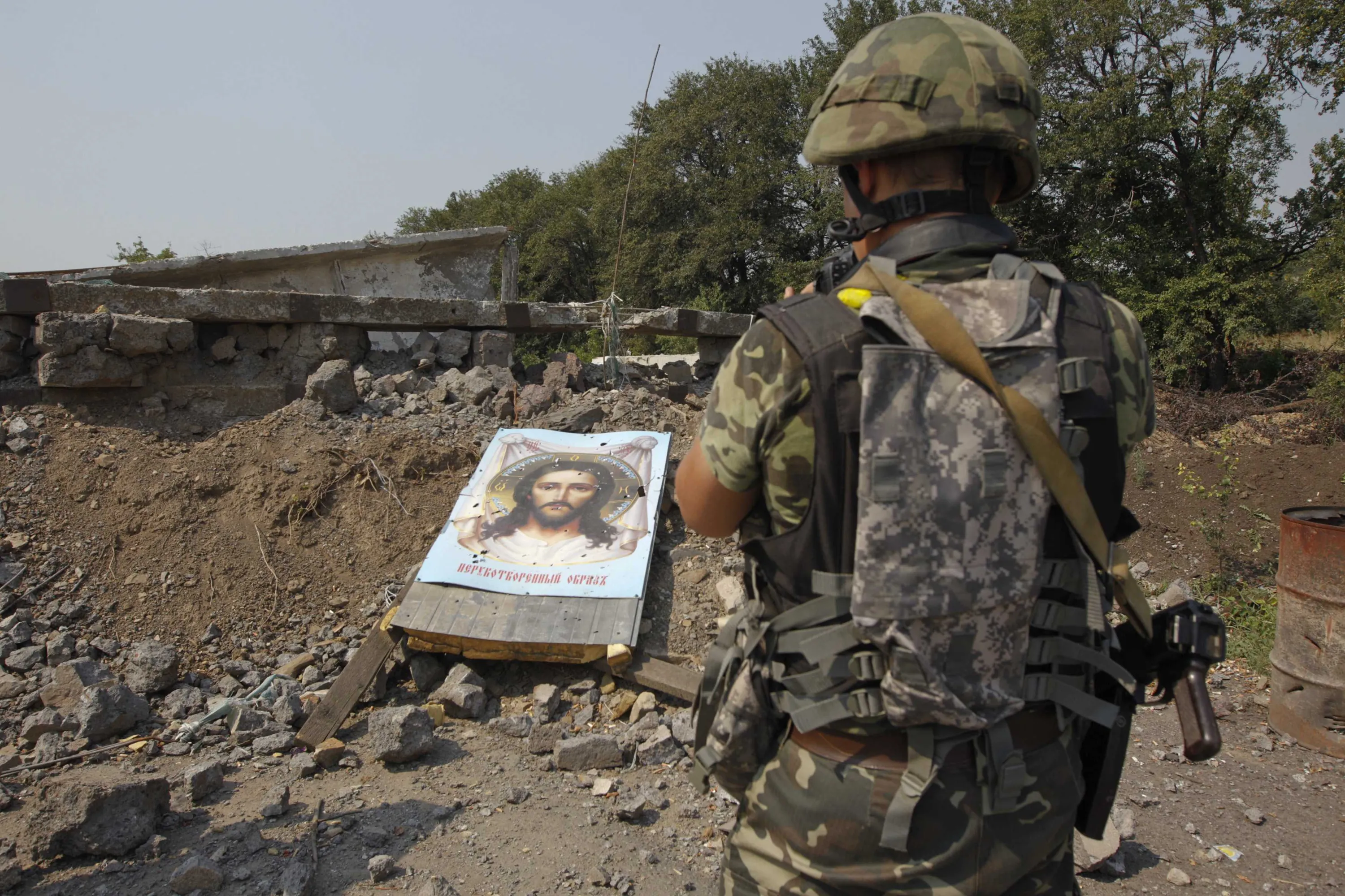 A Ukrainian serviceman stands near a damaged board with an image of Jesus Christ, which was left by pro-Russian separatists, at a check point in the town of Vuhlehirsk, Donetsk region, August 14, 2014. (Photo by Valentyn Ogirenko/Reuters)