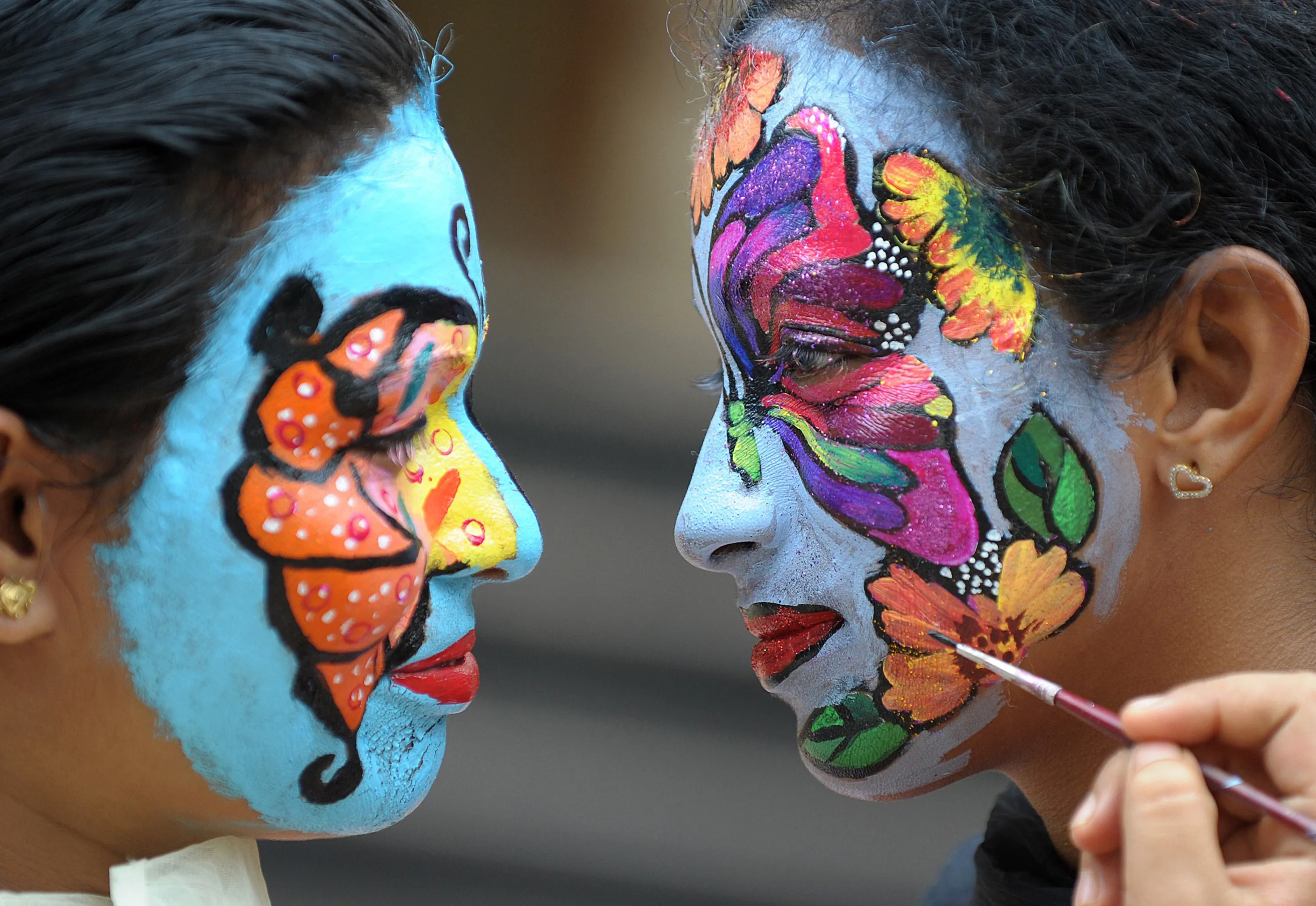 Indian nursing students participate in a face painting competition on the theme of “preserving the nature” at Vijay Marie College of Nursing in Hyderabad on August 11, 2014 on the occasion of the country's upcoming Independence Day celebrations. India celebrates its anniversary of Independence from Britian on August 15. (Photo by Noah Seelam/AFP Photo)