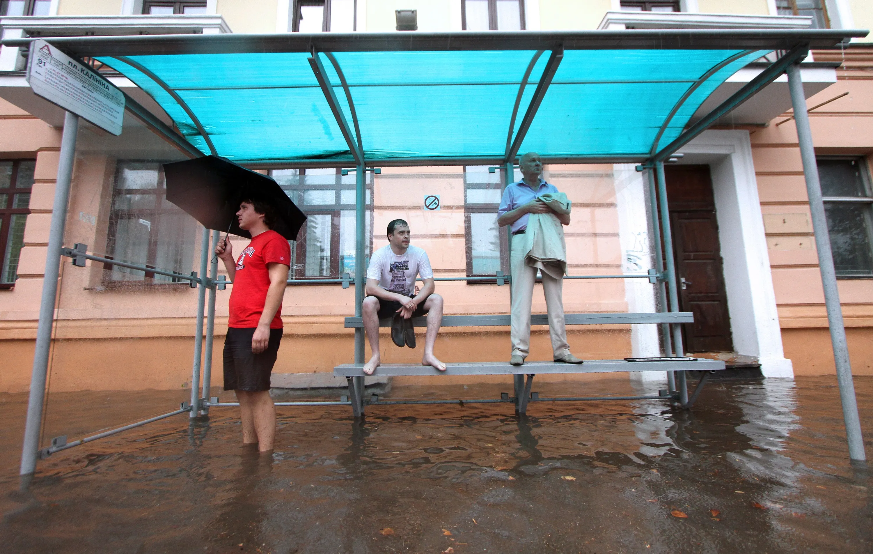 People wait for the bus in a flooded bus stop during heavy rain in Minsk, on August 12, 2014. (Photo by Sergei Gapon/AFP Photo)