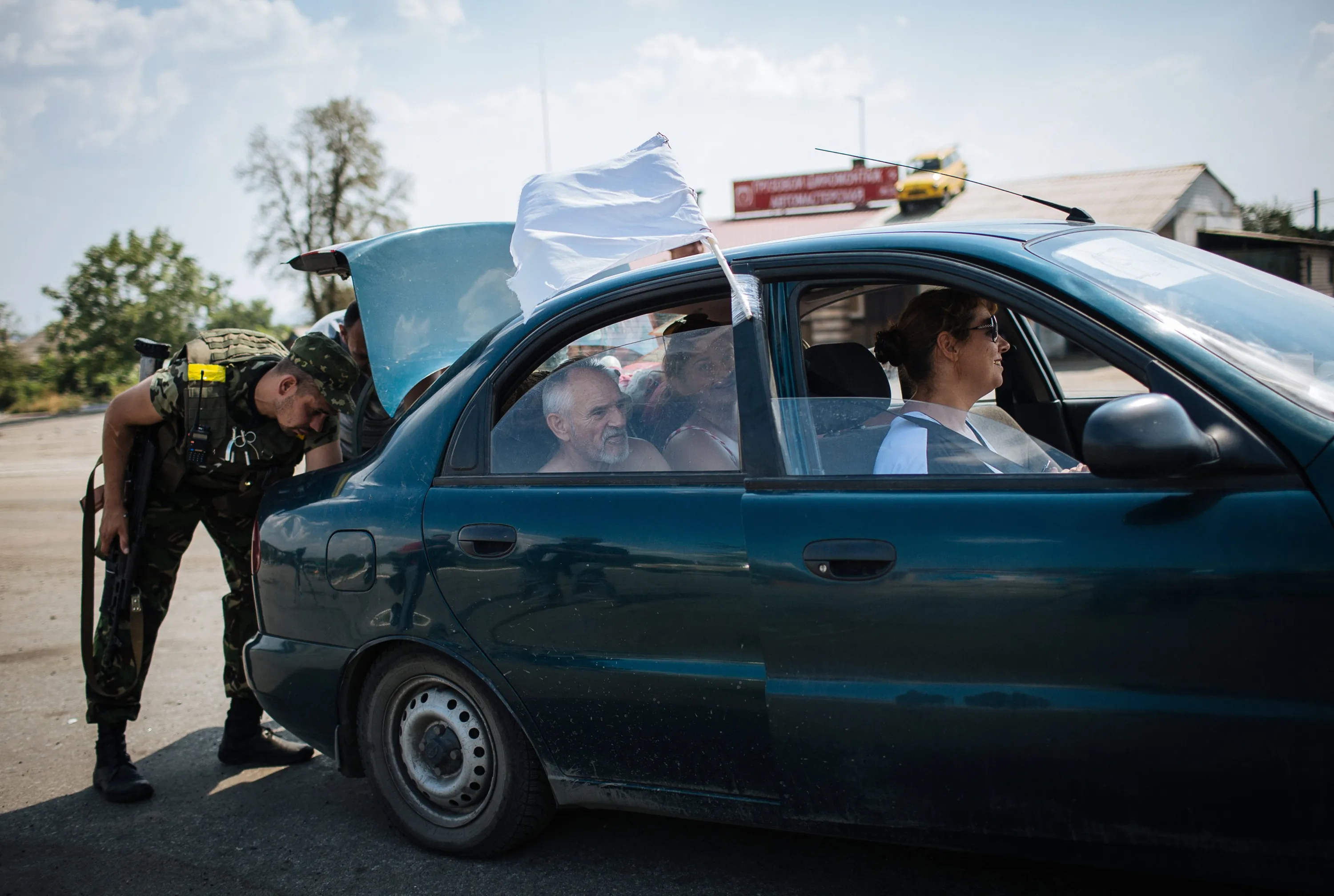 A Ukrainian soldier inspects a car at a checkpoint near the eastern Ukrainian city of Debalcevo, in Ukraine, 16 August 2014. Ukrainian forces partly destroyed a Russian military column inside Ukraine, President Petro Poroshenko said 15 August, but Russia insisted that no military vehicles had entered the neighbouring country. NATO and journalists from several newspapers confirmed Ukraine's reports of the Russian incursion. (Photo by Roman Pilipey/EPA)