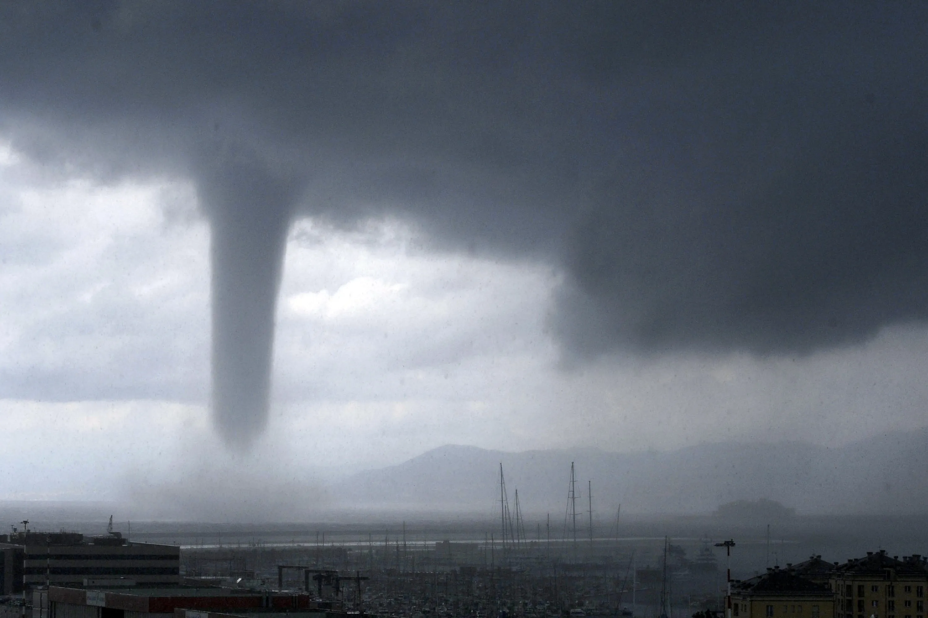 A tornado is seen approaching the costal city of Genoa, in Northern Italy, Tuesday, August 19, 2014. At right, in background, the profile of the Costa Concordia cruise liner wreck which was towed to Genoa for scrapping. Tornadoes and thunderstorms hit Genoa and the Liguria region coast Tuesday, causing damages to seaside cabins and floods but no victims. (Photo by Tano Pecoraro/AP Photo)