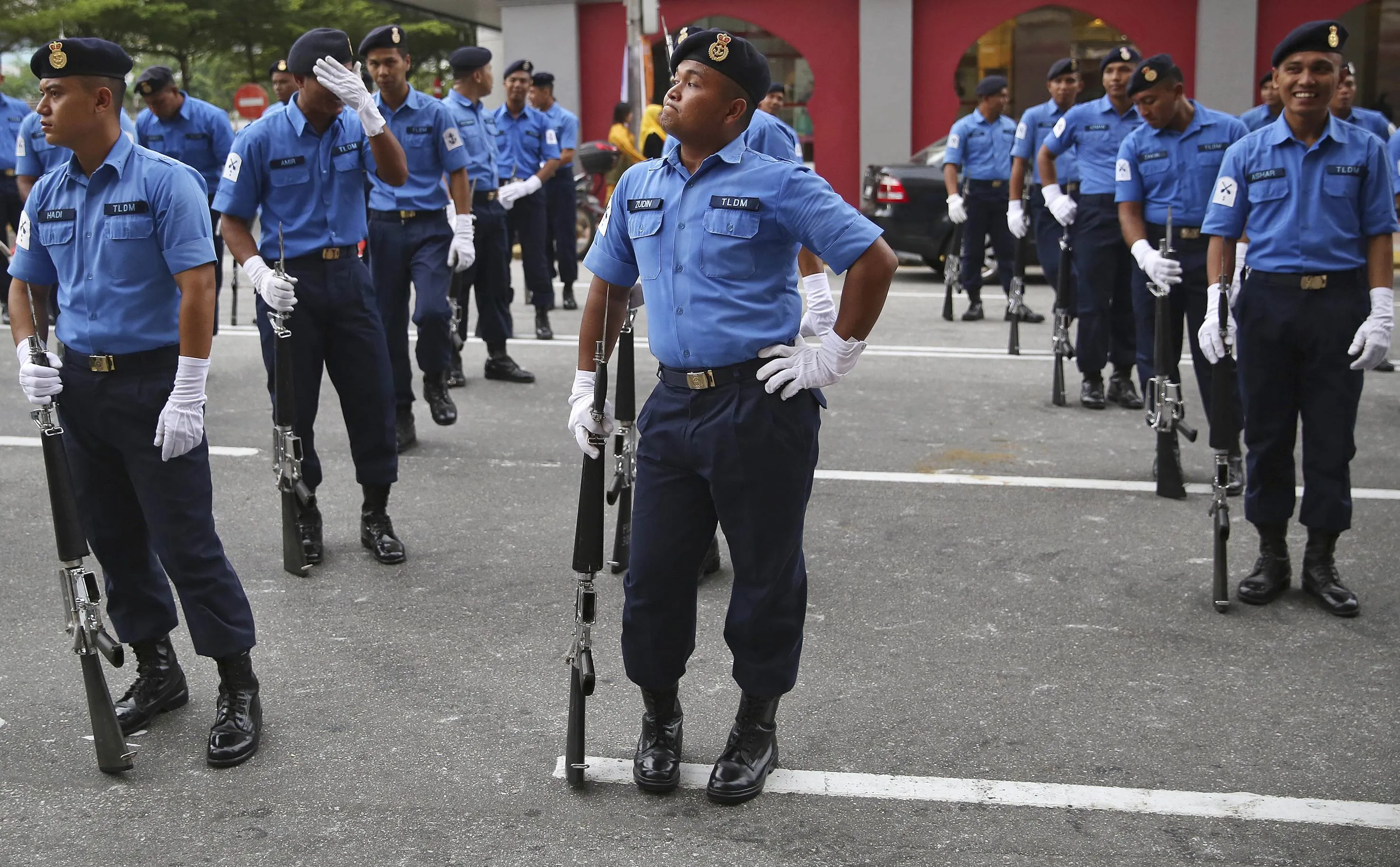 Malaysian policemen participate in a dress rehearsal for the upcoming Independence Day celebrations in Kuala Lumpur August 28, 2014. (Photo by Olivia Harris/Reuters)