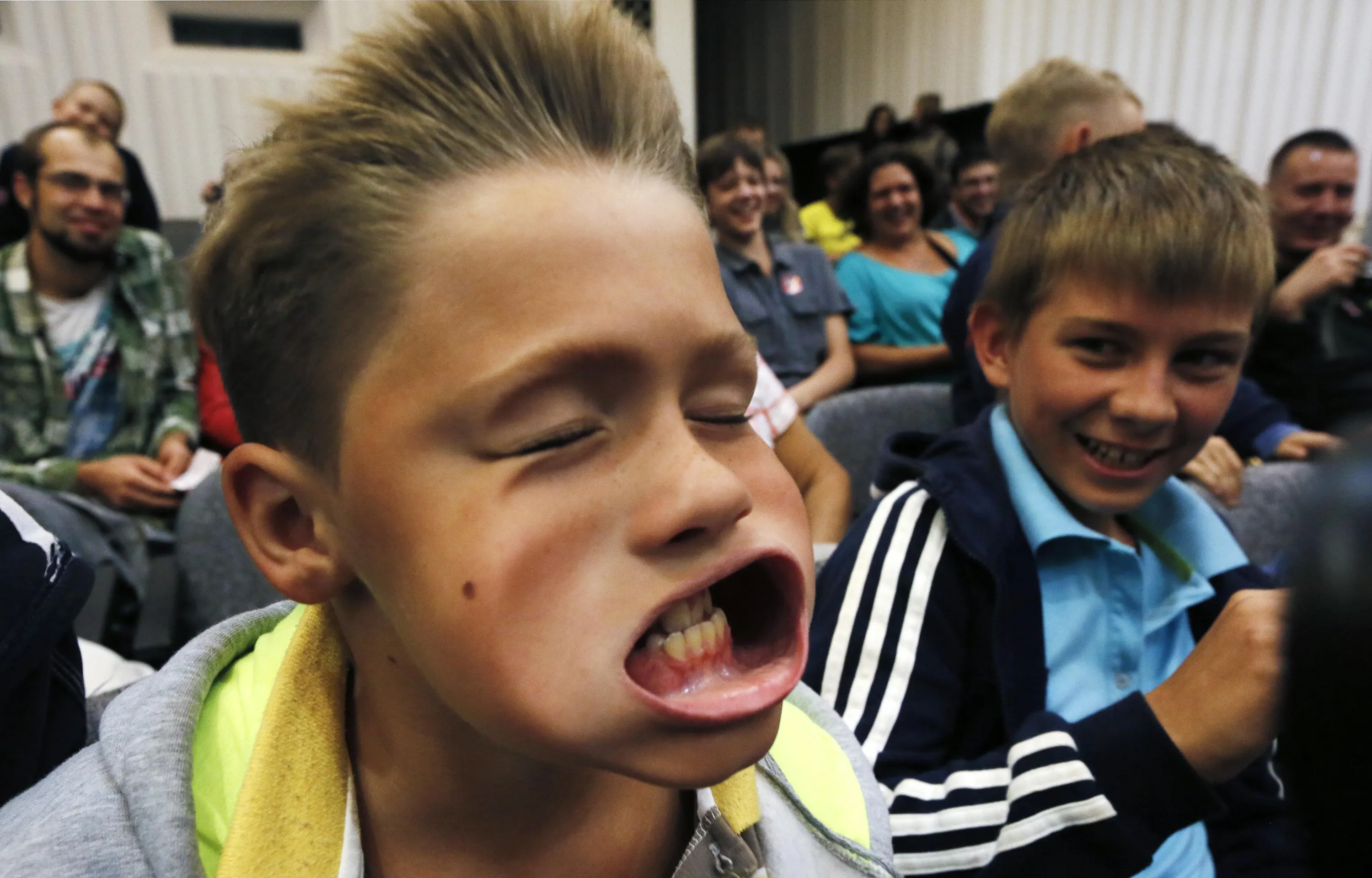 A participant experiences the effect of air pressure during a performance for school children organized by members of the “Newton Park” interactive museum of science at the Museum Centre in Krasnoyarsk, Siberia, August 29, 2014, several days before the beginning of a new academic year. A group of young engineers, scientists and researchers, who specialize in chemistry, applied mathematics and physics, founded an interactive museum of science to conduct experiments aimed at the popularization of the exact sciences for the pupils and their parents. (Photo by Ilya Naymushin/Reuters)