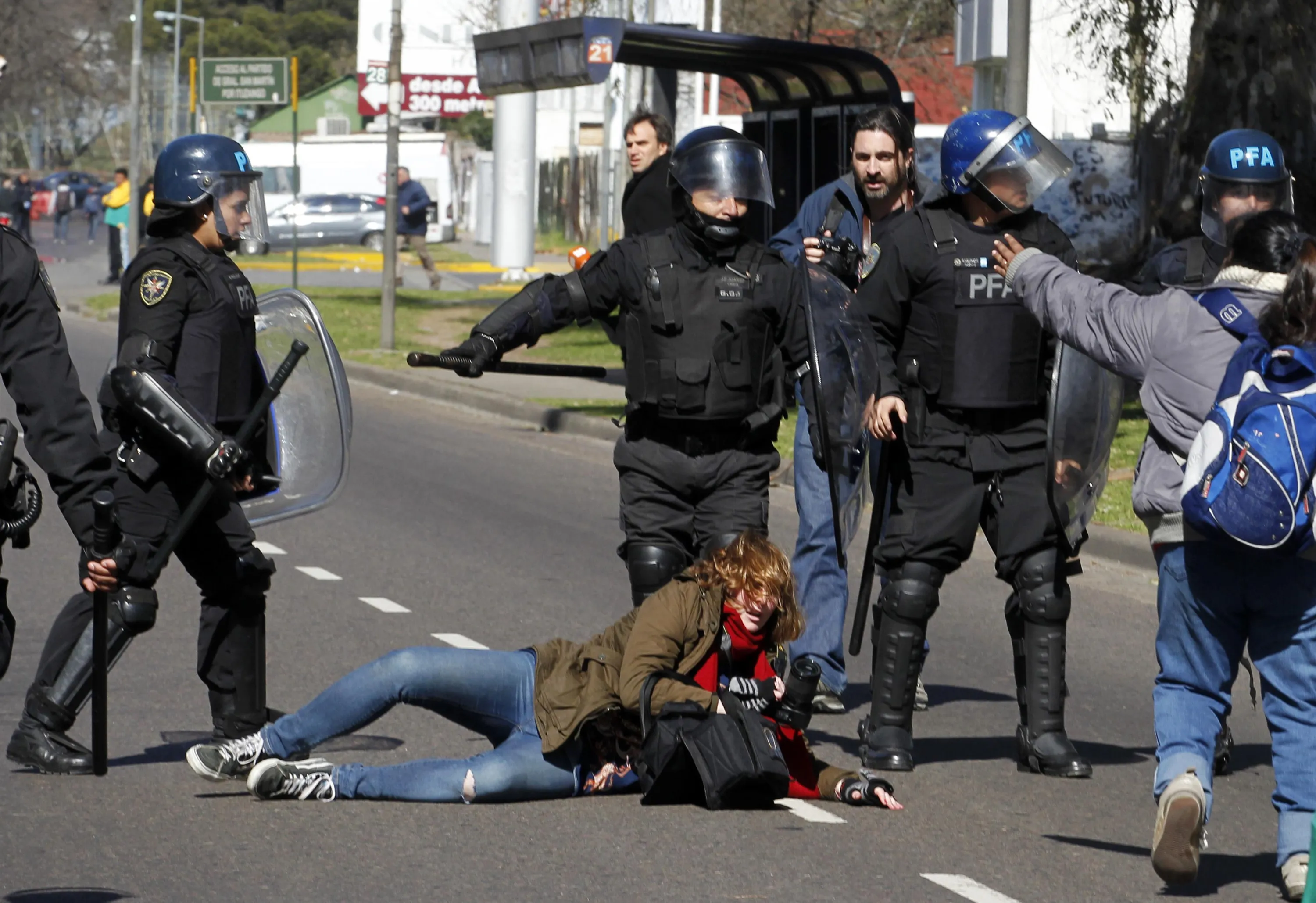 Photographer Maria Pirsch falls on the road after being hit by anti-riot policemen during a protest staged by state-run workers who were seeking to block a road in Buenos Aires August 27, 2014. Opposition labour unions have planned a 24-hour strike across Argentina for Thursday to press President Cristina Fernandez de Kirchner's administration for wage increases in line with inflation rate and to reduce the tax income in salaries. (Photo by Enrique Marcarian/Reuters)