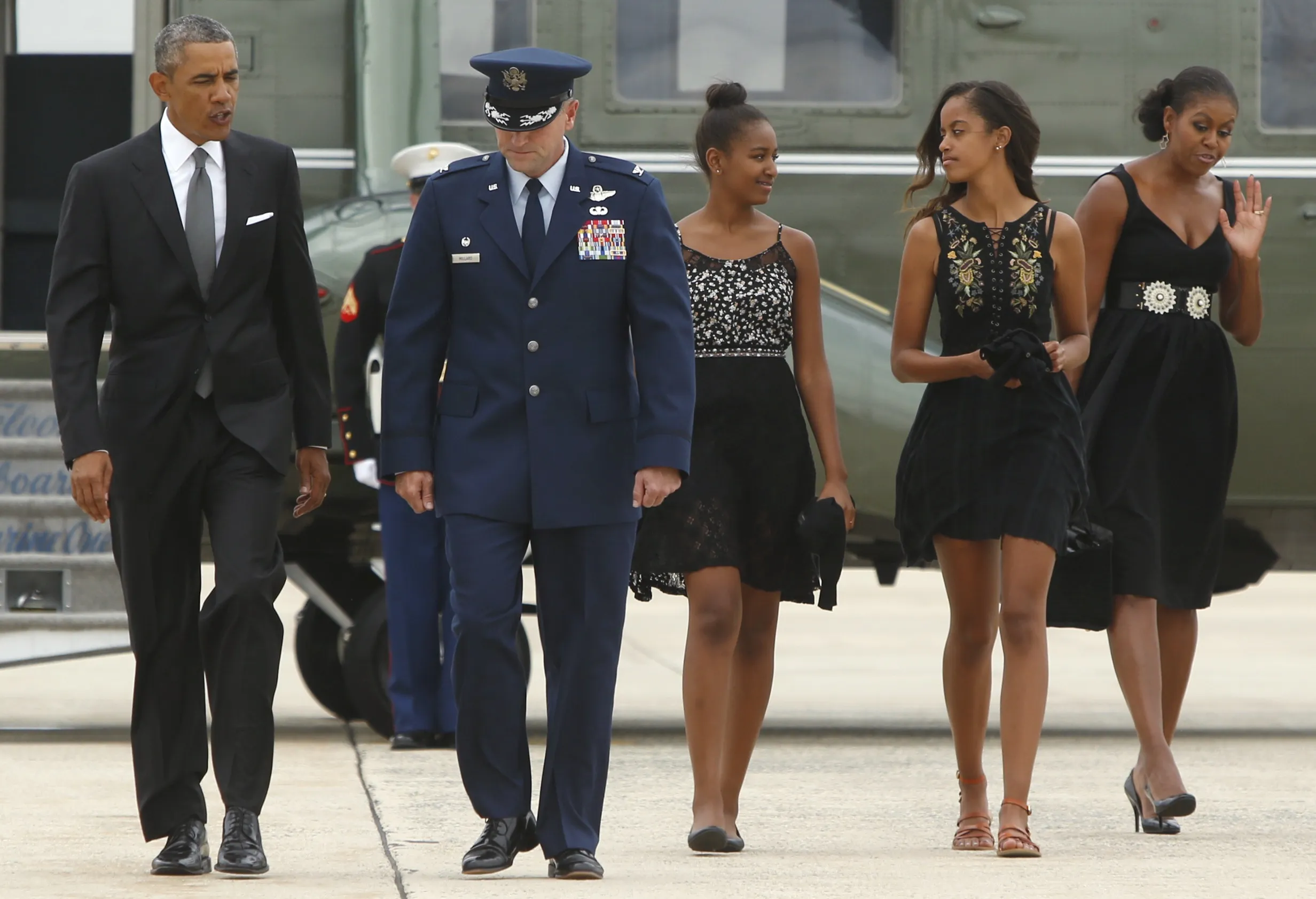 U.S. President Barack Obama (L-R) is escorted by U.S. Air Force Colonel John Millard as Obama, his daughters Sasha and Malia and first lady Michelle Obama arrive to board Air Force One at Joint Base Andrews, Maryland August 30, 2014. Obama is visiting New York on Saturday to attend a personal event. (Photo by Jonathan Ernst/Reuters)