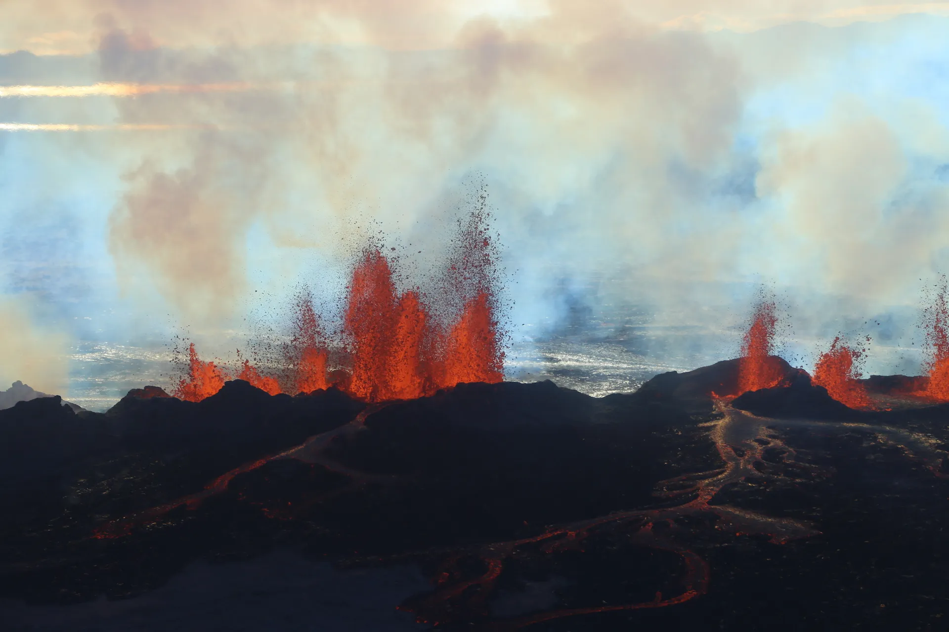 In this aerial view, fountains of lava, up to 60 meters high, spurt from a fissure in the ground on the north side of the Bardarbunga volcano in Iceland, Tuesday, September 2, 2014. The alert warning for the area surrounding Iceland's Bardarbunga volcano remained at orange on Tuesday, indicating that it is showing increased unrest with greater potential for an explosive eruption. (Photo by Stefano Di Nicolo/AP Photo)