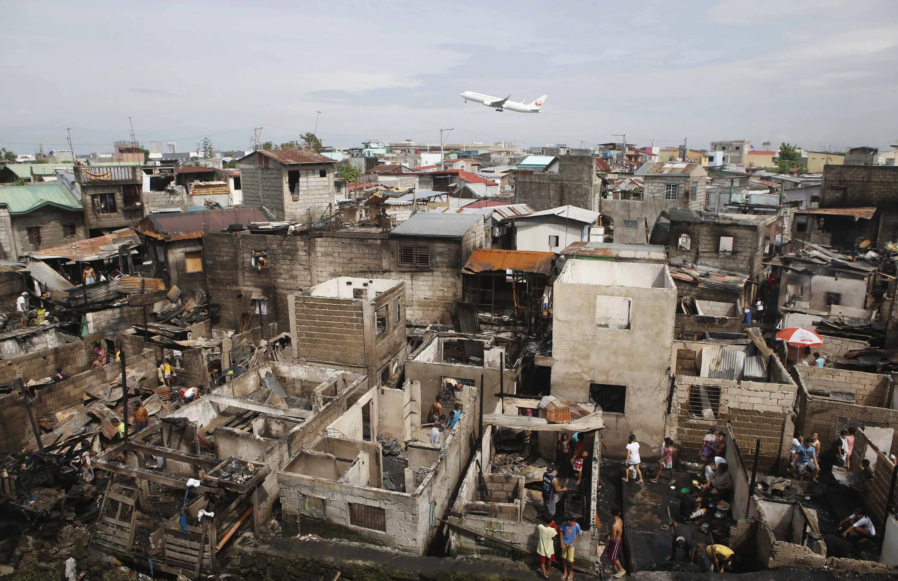 Residents sift through the ruins of their homes, which were razed by a neighbourhood fire as an aircraft takes off at the nearby Ninoy Aquino International airport in Paranaque, Metro Manila September 16, 2014. Some 100 families were left homeless after 60 houses in the neighbourhood of Paranaque were destroyed by a fire caused by faulty electrical wiring on Monday evening, local media said. (Photo by Erik De Castro/Reuters)