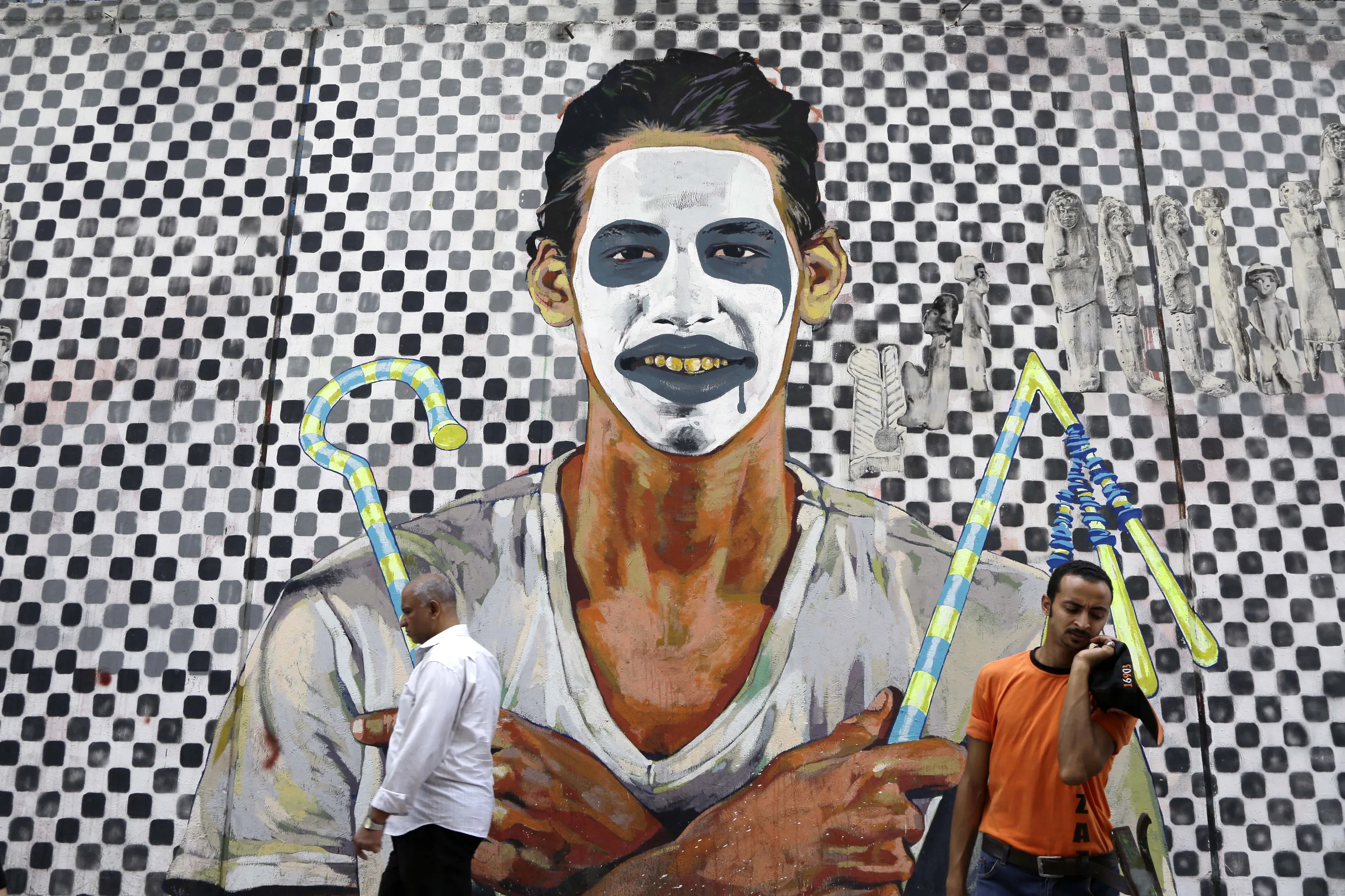 Egyptians walk past recent graffiti with modern and Pharaonic motifs in Mohammed Mahmoud Street near Tahrir Square, in downtown Cairo, Egypt, Wednesday, September 17, 2014. Street art in Cairo, which flourished following the uprising that ousted former President Hosni Mubarak, has mostly been painted over by authorities, but on Mohammed Mahmoud street artists use the whitewashed walls for new art works. (Photo by Hassan Ammar/AP Photo)