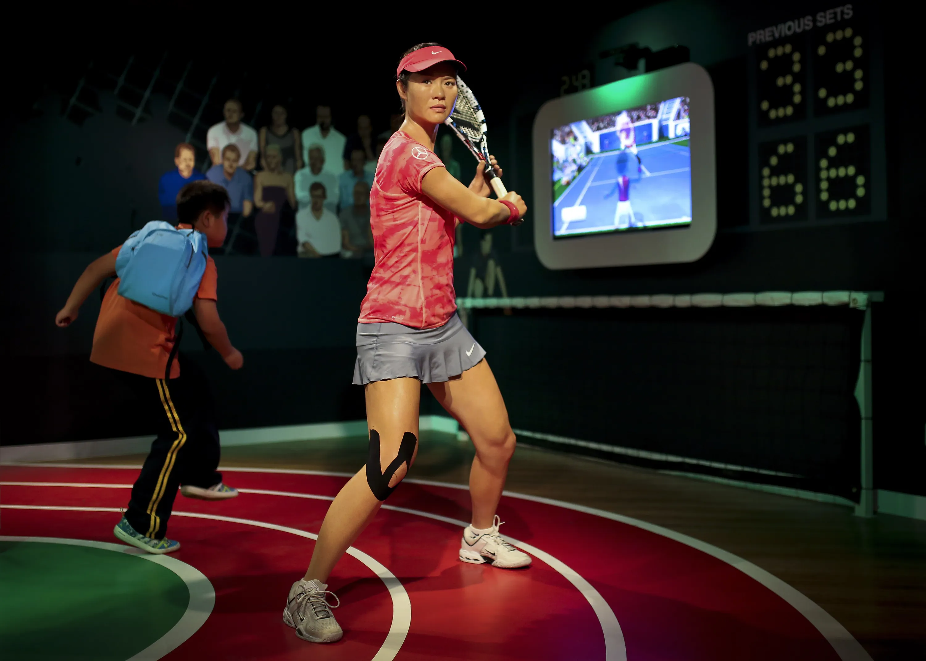 A student plays with a motion-controlled tennis games near a wax figure of Chinese tennis player Li Na on display at the Madame Tussauds Museum in Beijing, China Friday, September 19, 2014. Li Na, a two-time Grand Slam champion from China who took tennis in Asia to a new level, has retired due to recurring knee injuries. (Photo by Andy Wong/AP Photo)