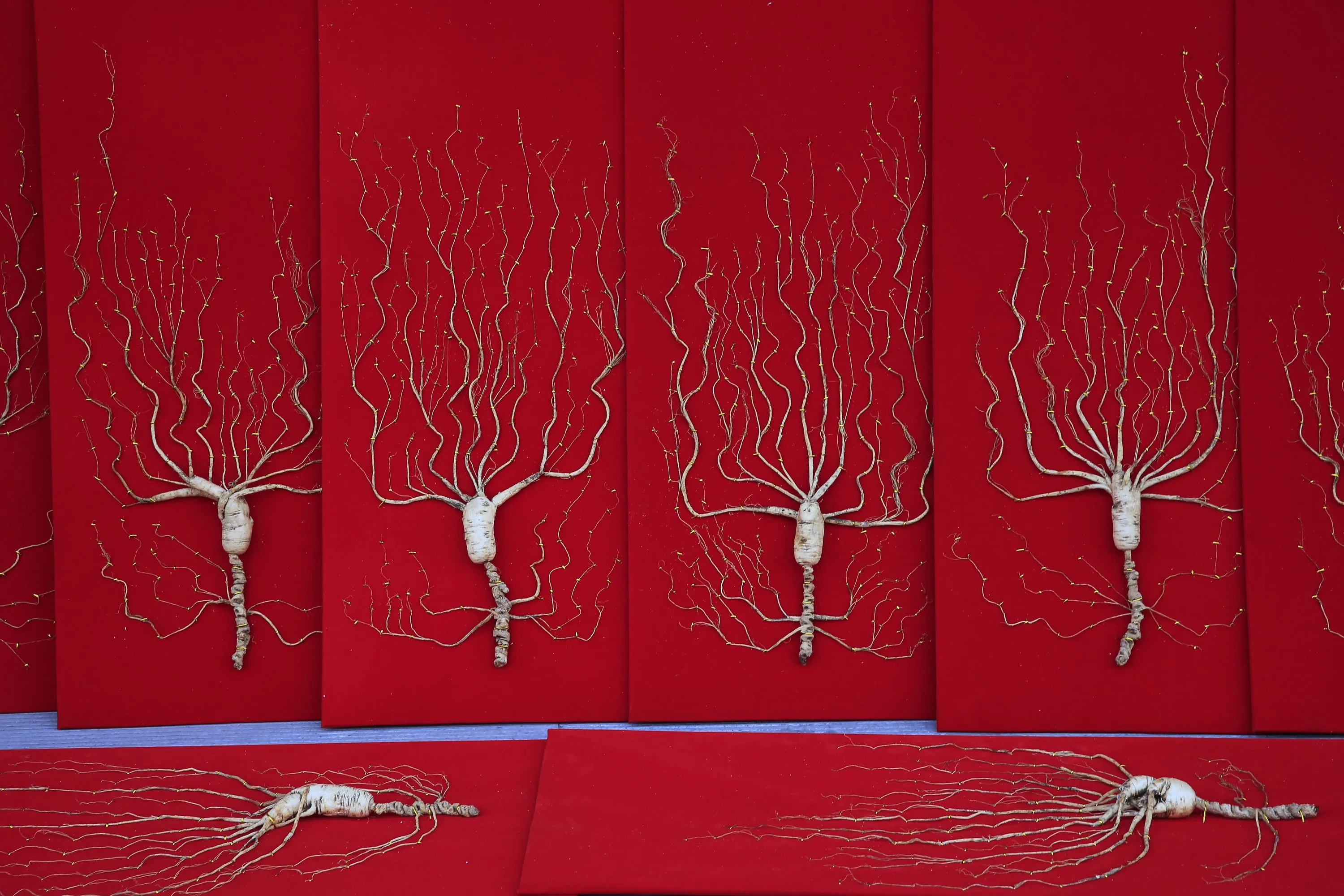 Ginsengs are seen on sale at a market in Baishan, Jilin province, September 22, 2014. Some 50-year-old ginsengs are displayed and each is worth at least approximately 150,000 yuan ($24,430), according to the seller. (Photo by Reuters/Stringer)