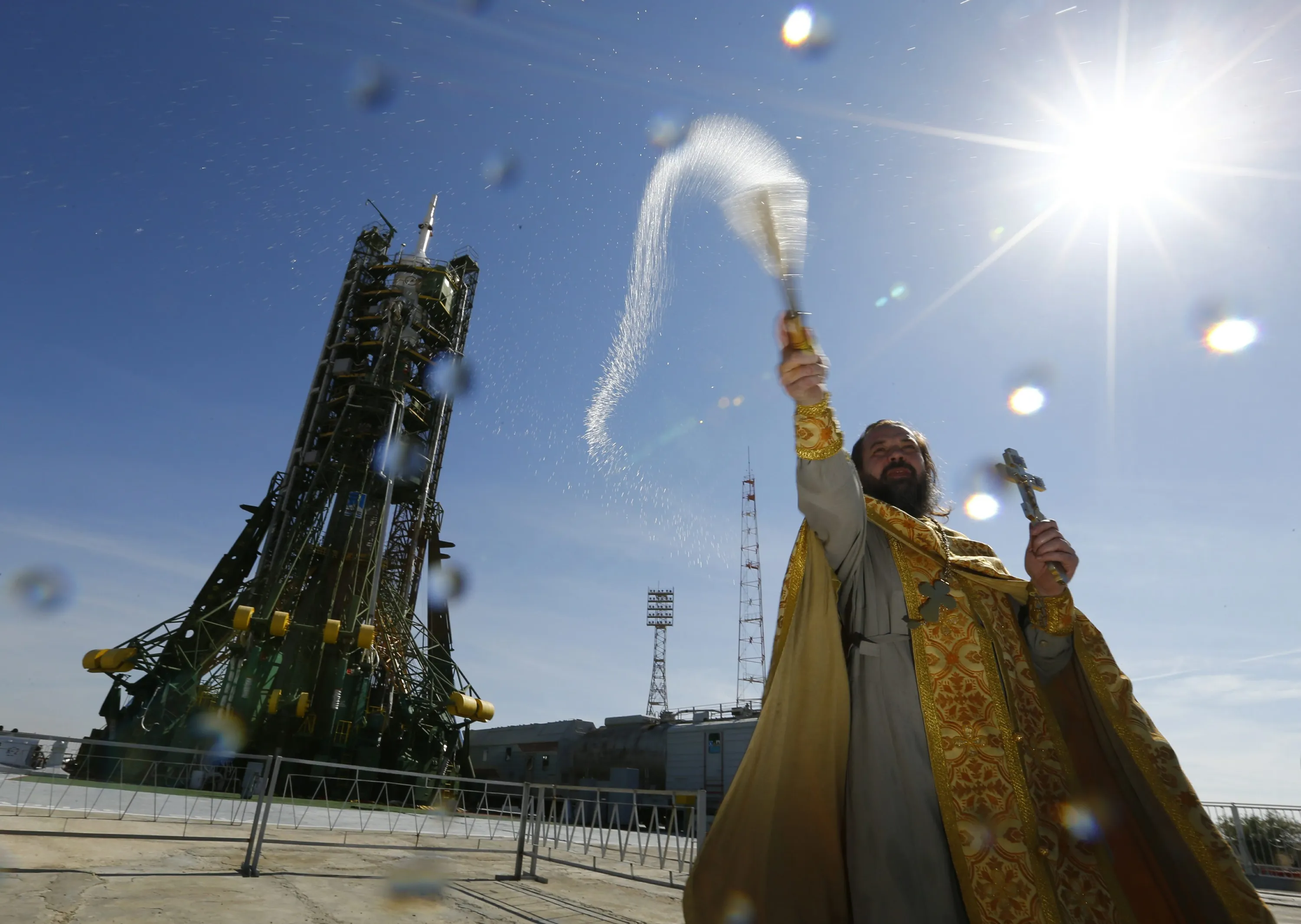 An Orthodox priest conducts a blessing in front of the Soyuz TMA-14M spacecraft set on the launch pad at Baikonur cosmodrome September 24, 2014. (Photo by Shamil Zhumatov/Reuters)