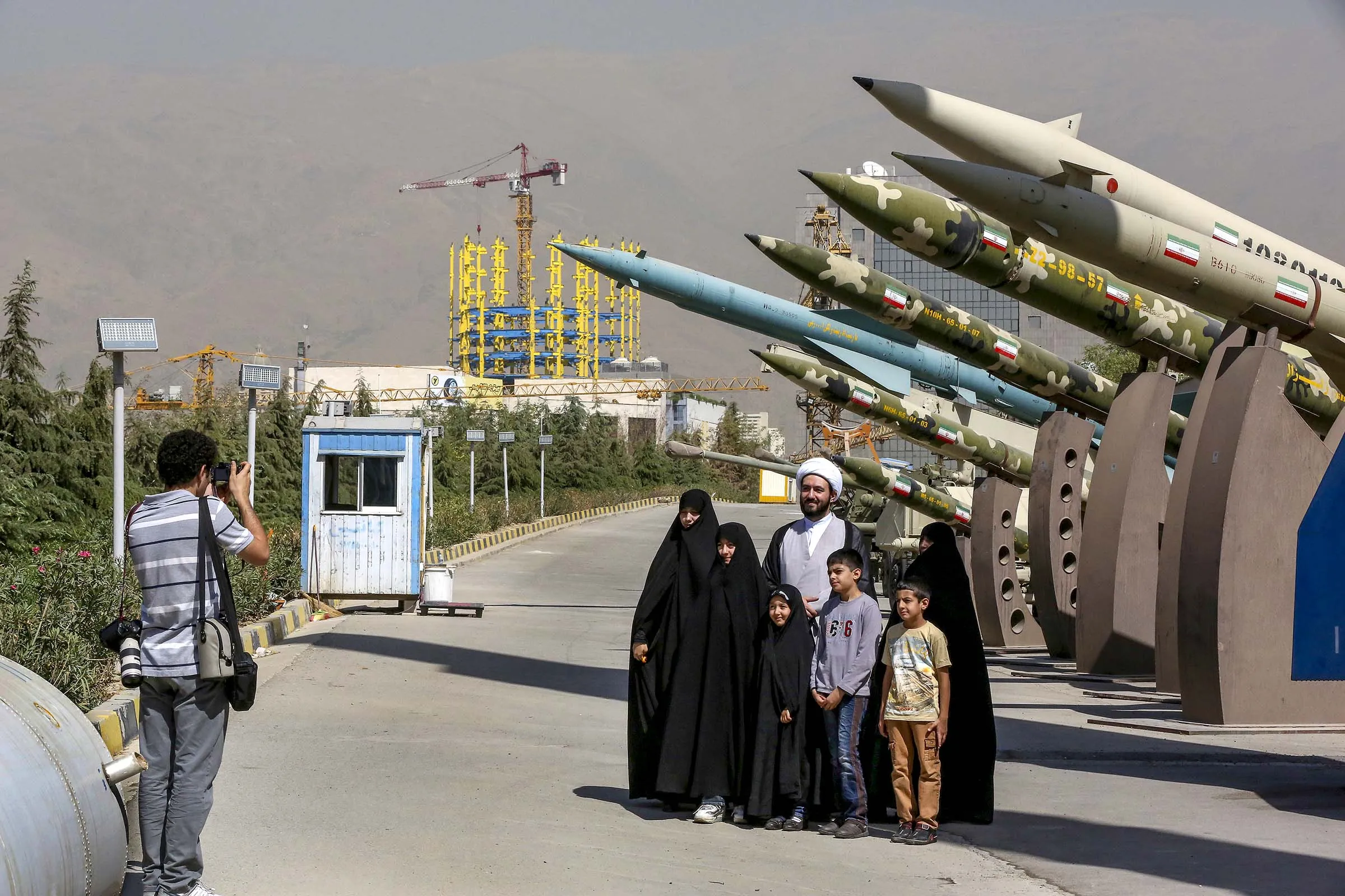 Iranian photographer Arash Khamooshi takes a photograph of cleric Mohammad Kalbasi and his family as they visit an exhibition on the 1980-88 Iran-Iraq war, at a park, northern Tehran, Iran, Thursday, Sept. 25, 2014. Iran begun a week of celebration starting Monday called “Sacred Defense Week” to mark the 34th anniversary of the outset of its war with Iraq which imposed by the Iraqi dictator Saddam Hussein that left about a million casualties on both sides. (Photo by Vahid Salemi/AP Photo)