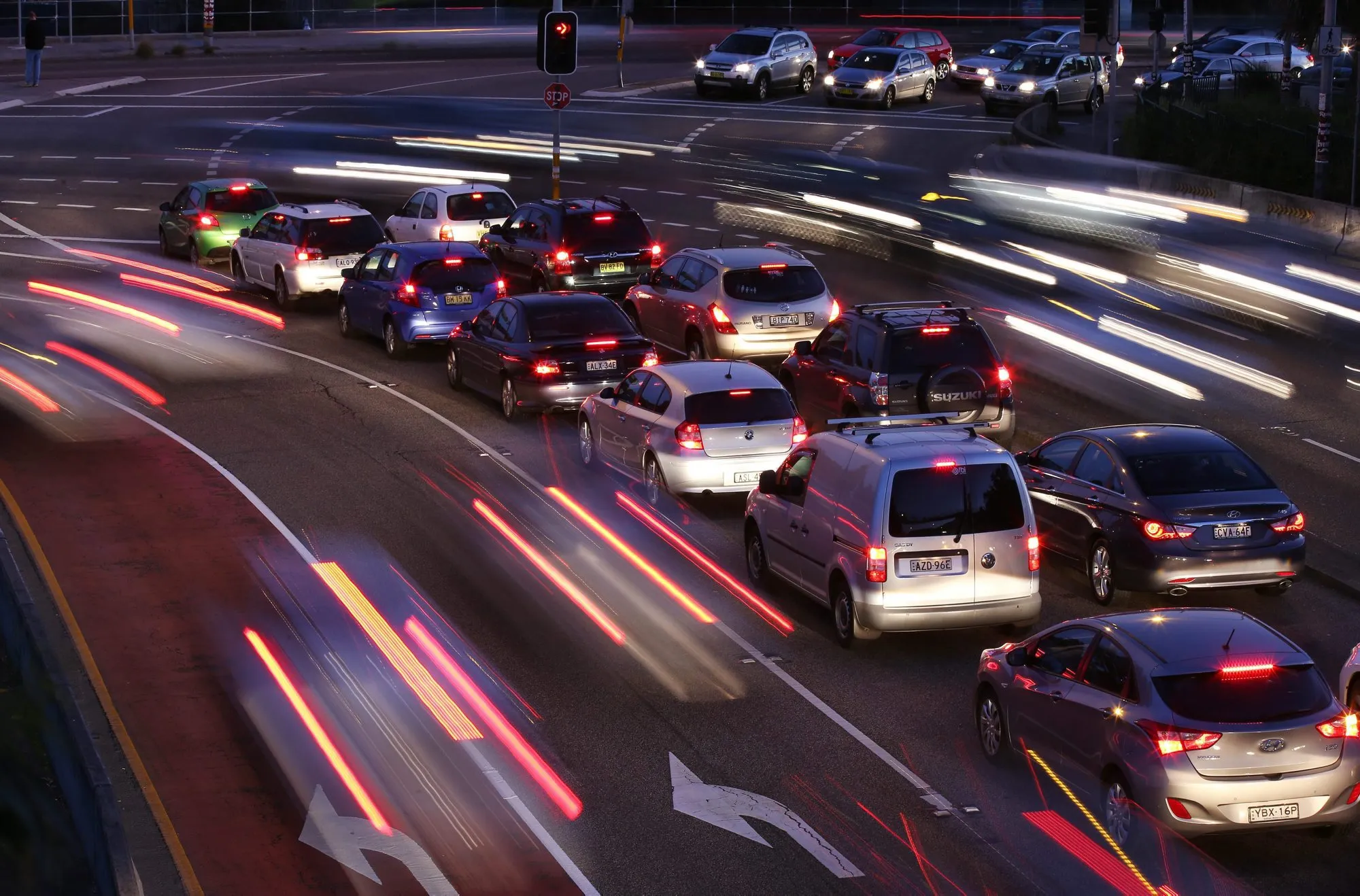 In this Wednesday, September 17, 2014, photo, the headlights and taillights of moving cars streak past stationary cars waiting for their turn at an intersection during the evening rush hour in Sydney. (Photo by Rick Rycroft/AP Photo)