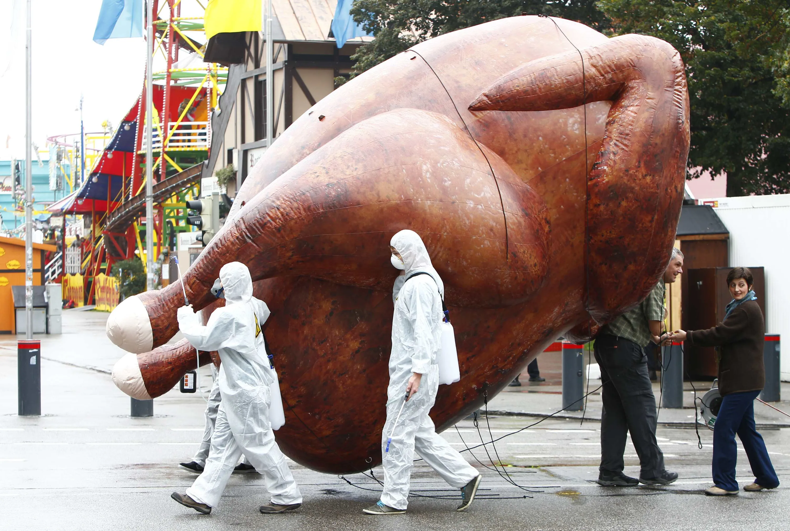 Environmental activists carry a giant inflatable chicken as the demonstrate against “chlorine chickens” near the Oktoberfest grounds in Munich October 1, 2014. The protest is against the planned Free Trade Agreements TTIP (Transatlantic Trade and Investment Partnership) and CETA (Comprehensive Economic and Trade Agreement) with the U.S. and Canada, which opponents fear will allow U.S. chlorine-washed chicken and hormone treated meat into the EU. The so-called chlorine chicken has become a symbol of the health risks opponents say the free trade agreements represent. (Photo by Michaela Rehle/Reuters)