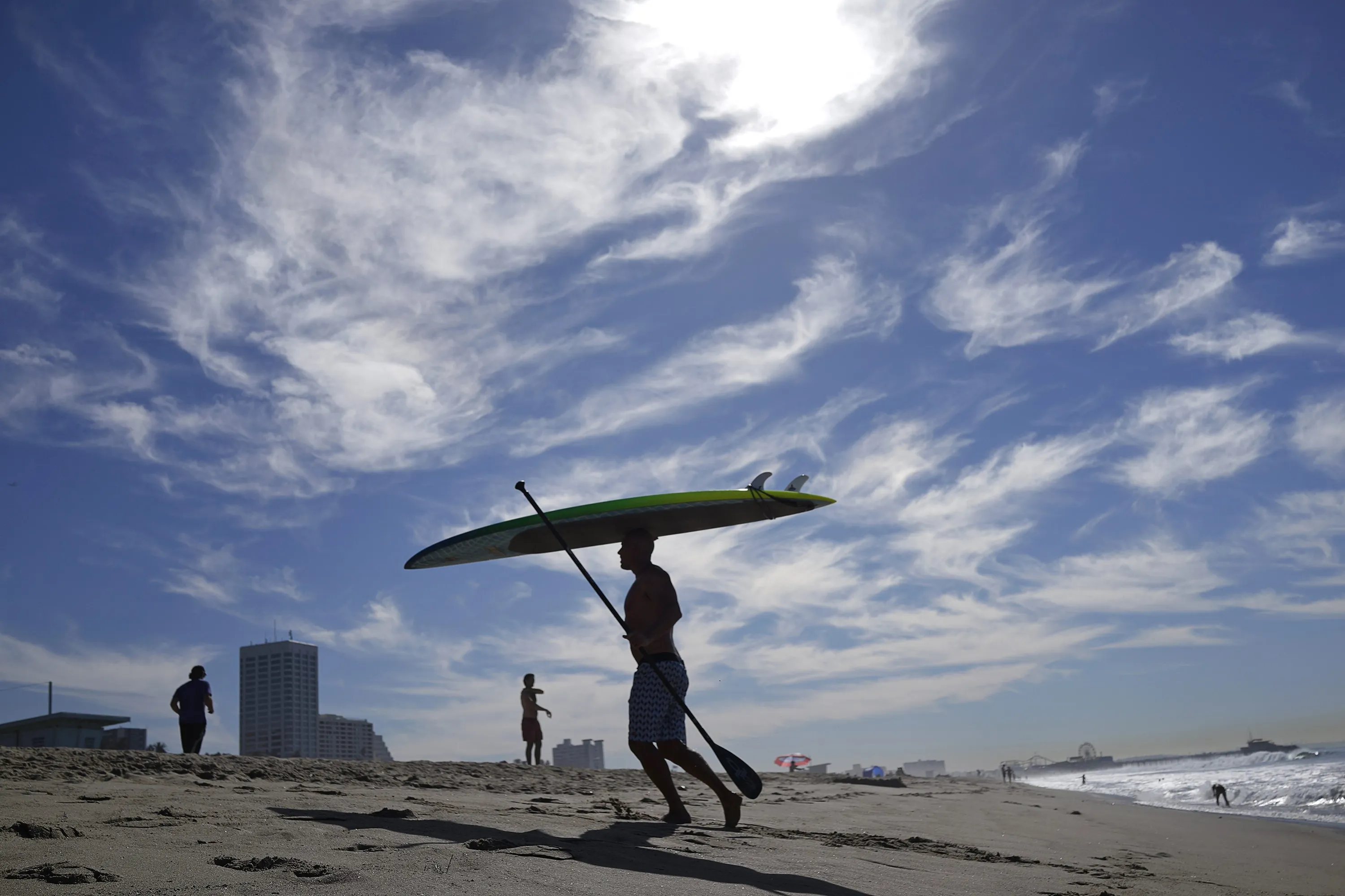 A paddleboarder walks out of the Pacific Ocean onto the beach in Santa Monica, California October 4, 2014. The fall season has brought a wave of hot, dry weather to California, with parts of the state baking this weekend in triple-digit temperatures and officials expressing concern the summer-like heat could spark a massive wildfire. Temperatures were above 100 degrees Fahrenheit (38 degrees Celsius) in Southern California, which is in a heat wave. (Photo by Lucy Nicholson/Reuters)
