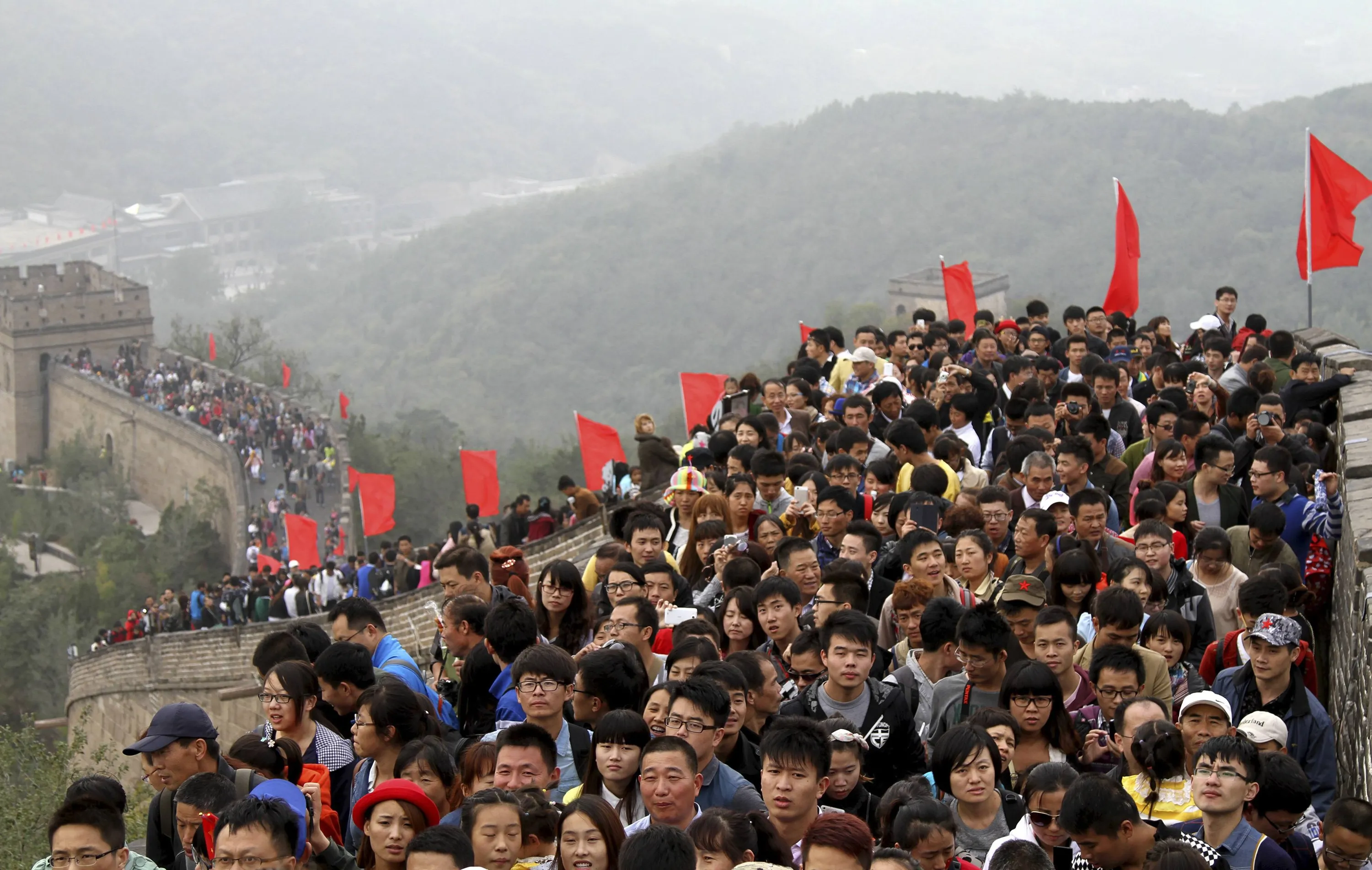 Tourists visit the Great Wall on the third day of the seven-day national day holiday, on the outskirts of Beijing, October 3, 2014. The national day holiday, known by many Chinese as “the Golden Week” for travel, started on October 1 this year, celebrating the 65th anniversary of the founding of the People's Republic of China. According to a prediction by the China Tourism Academy, a total of 480 million trips are expected to be made by travellers within these seven days, Xinhua News Agency reported. (Photo by Reuters/Stringer)