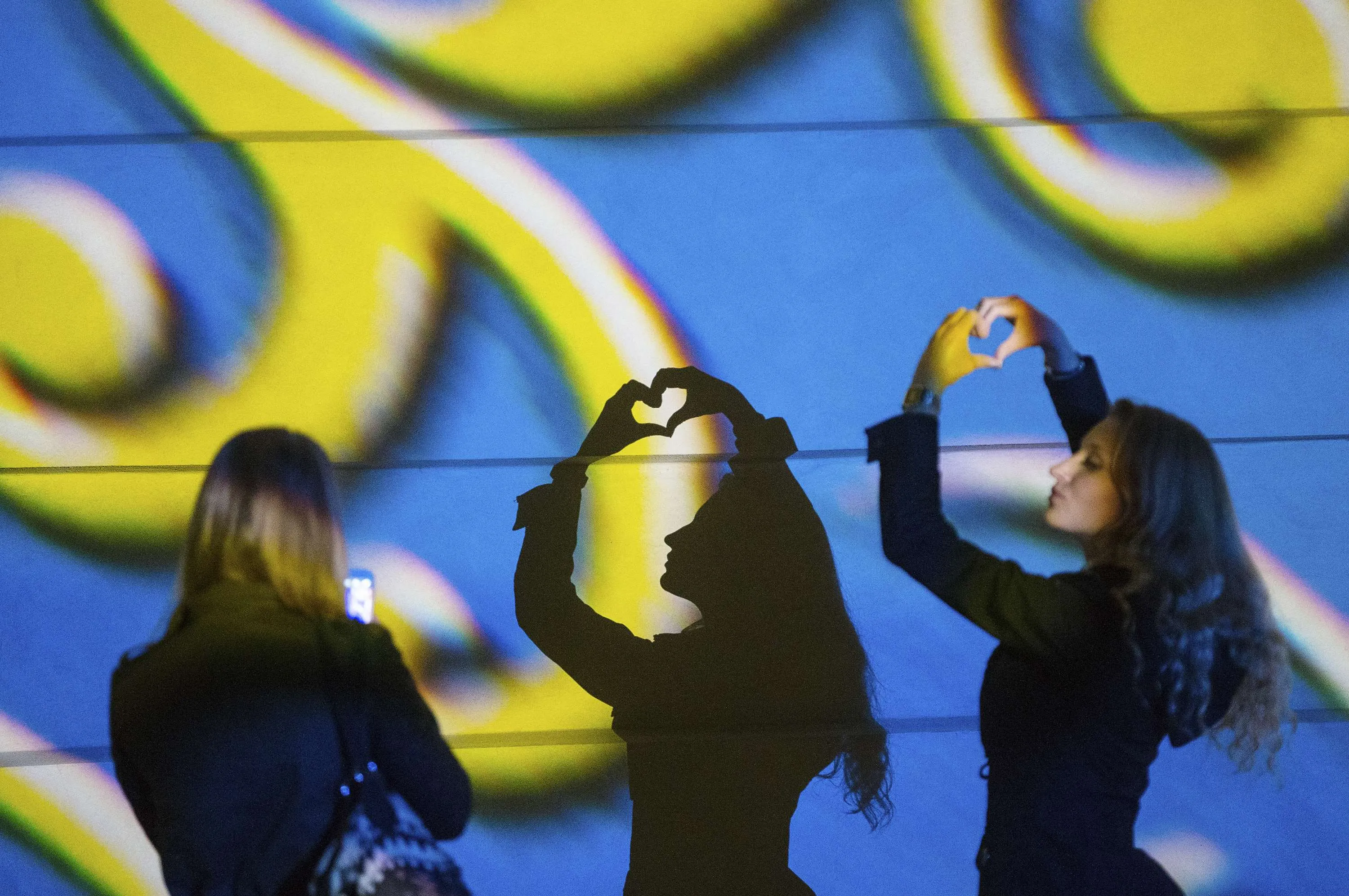 People pose for pictures in front of a light installation at the Old Royal Library during the opening day of the “Festival of Light” show in Berlin October 10, 2014. Several landmarks and tourist spots will be illuminated in the German capital from October 10 to 19. (Photo by Hannibal Hanschke/Reuters)
