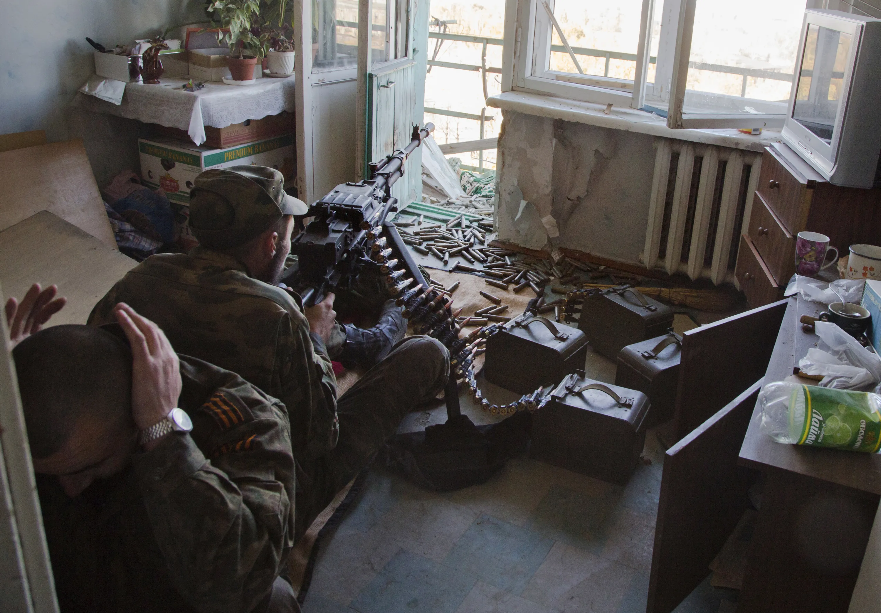 Pro-Russian rebels fire toward Ukrainian positions near to the airport in the town of Donetsk, eastern Ukraine Tuesday, October 7, 2014. Despite a cease-fire declared a month ago between the Ukrainian forces and pro-Russian rebels, the biggest city in eastern Ukraine remains embroiled in fighting. (Photo by Dmitry Lovetsky/AP Photo)