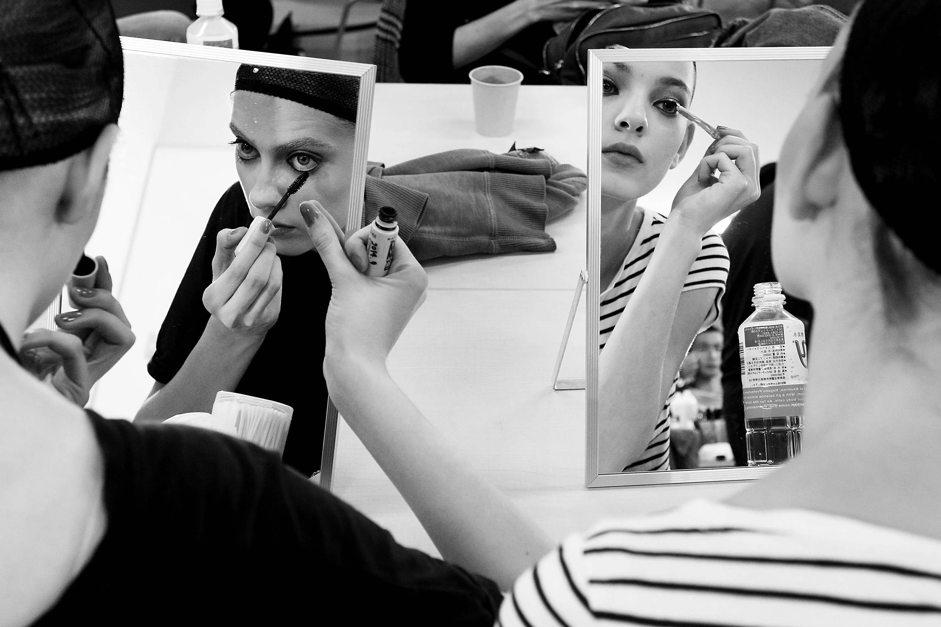 Models prepare backstage ahead of the DRESSCAMP show as part of Mercedes Benz Fashion Week TOKYO 2015 S/S at Shibuya Hikarie on October 13, 2014 in Tokyo, Japan. (Photo by Lisa Maree Williams/Getty Images)