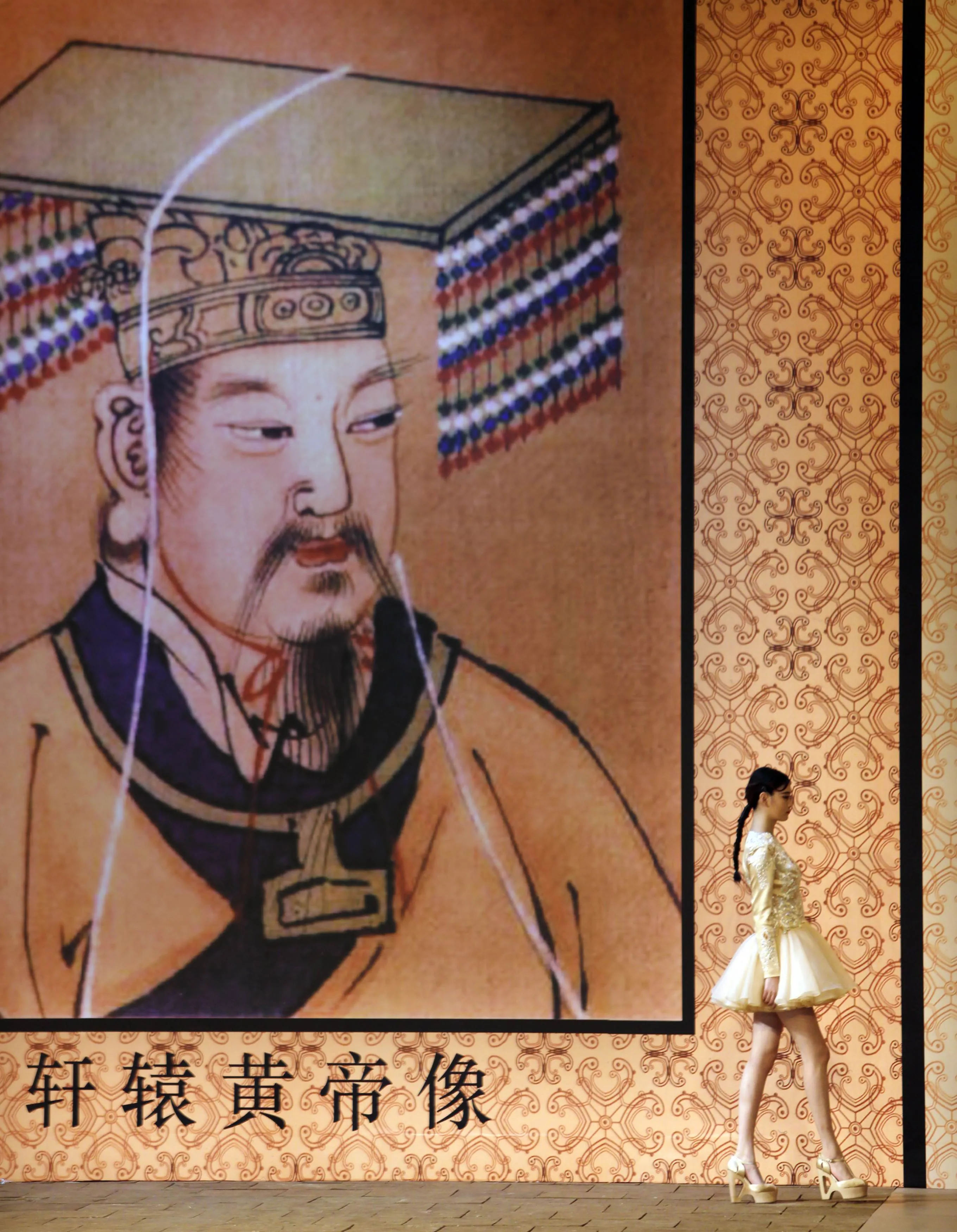 A model presents a creation by Chinese designer Zhang Zhifeng from 2014 NE TIGER Haute Couture Collection in front of a picture of the Yellow Emperor Xuan Yuan, who is considered by many to be the ancestor of the Chinese people, at China Fashion Week in Beijing, October 25, 2014. (Photo by Jason Lee/Reuters)
