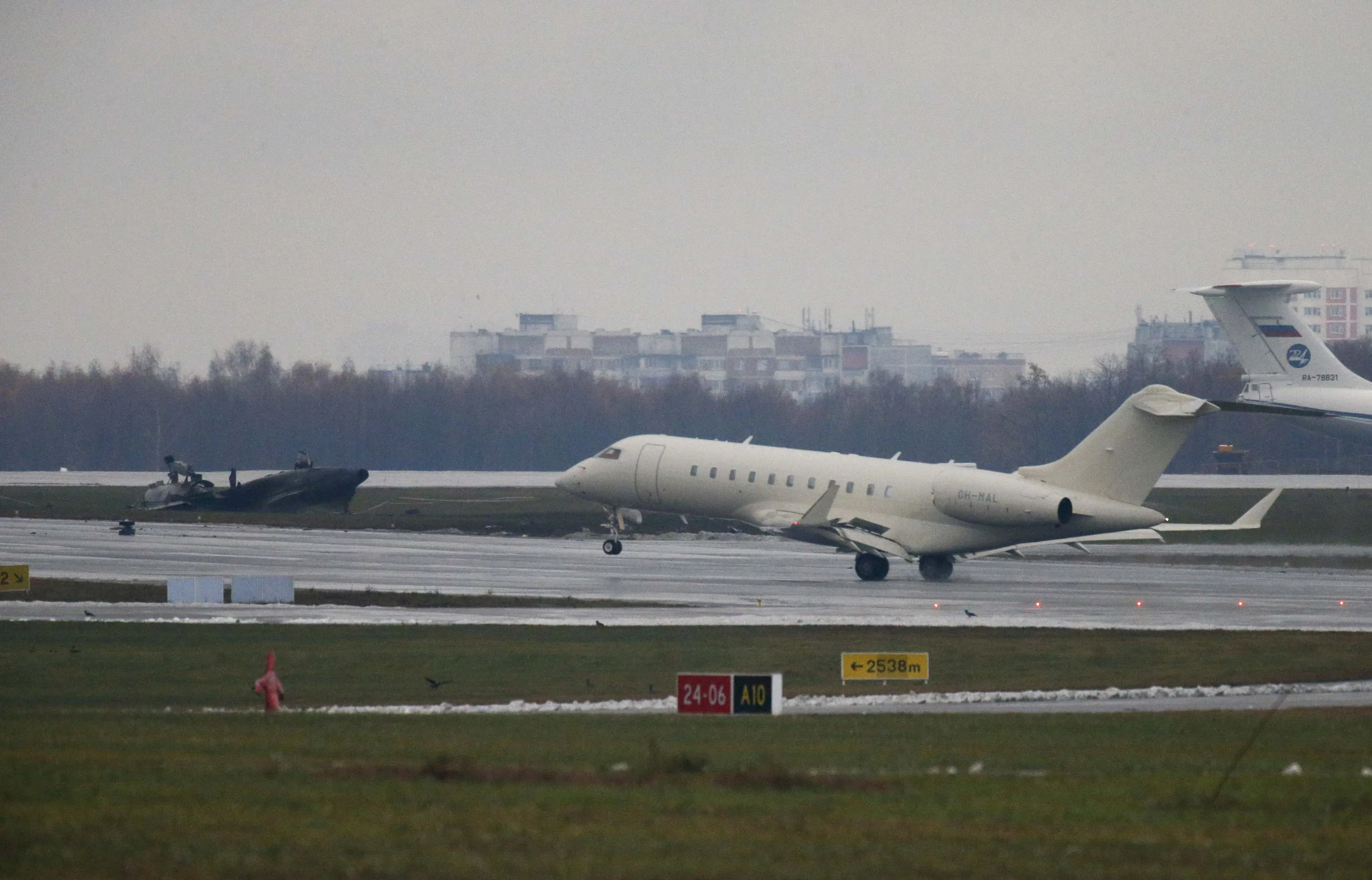 A plane takes off in front of what is believed to be the wreckage of the chief executive of Christophe de Margerie's Dassault Falcon jet at Moscow's Vnukovo airport, October 21, 2014. The chief executive of French oil major Total, Christophe de Margerie, was killed when his private jet collided with a snow plow as it was taking off from Moscow's Vnukovo airport on Monday night. (Photo by Maxim Zmeyev/Reuters)