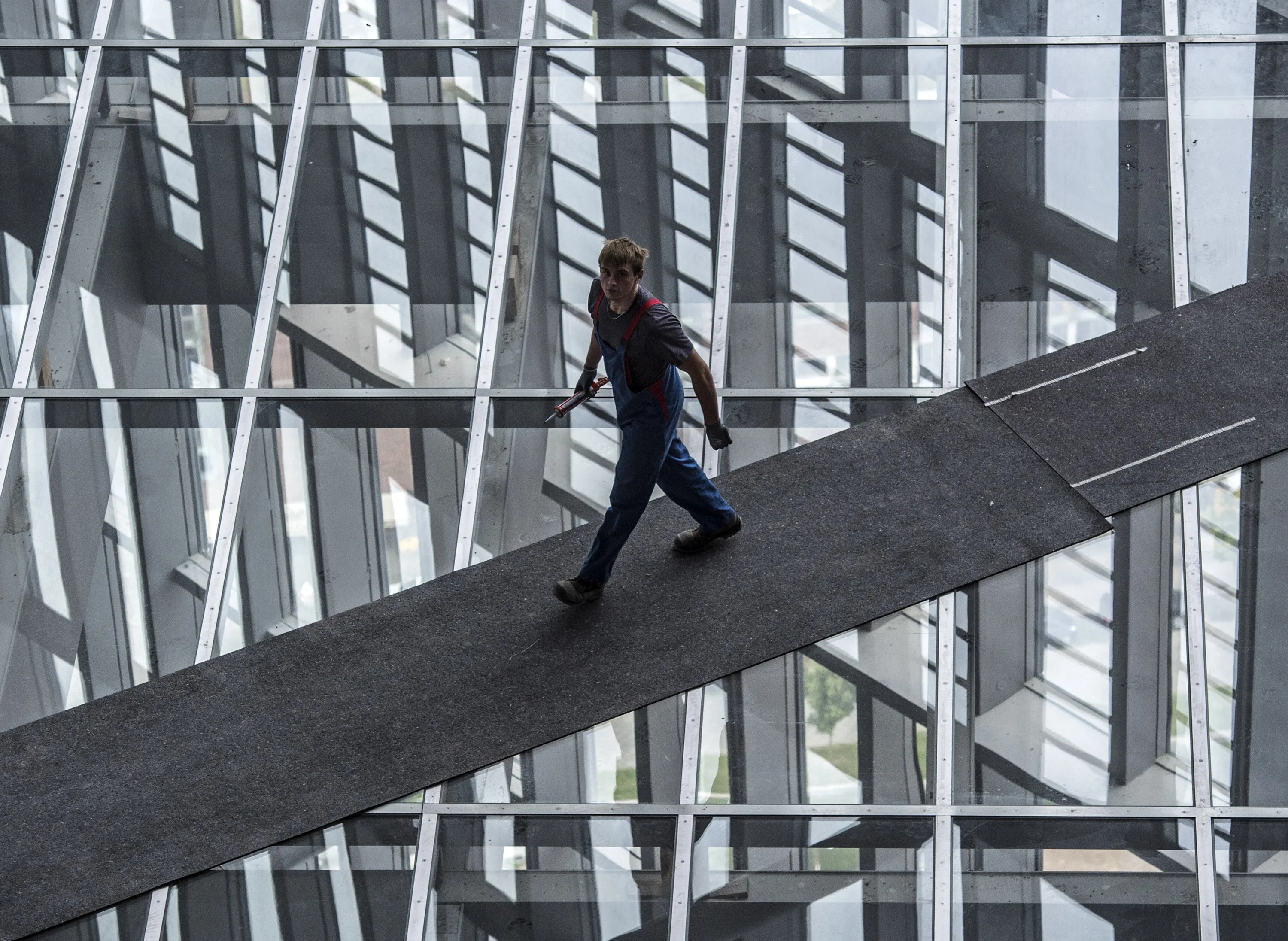 A worker walks in the new headquarters of the European Central Bank during a media tour at the construction site in Frankfurt, Germany, Tuesday, October 21, 2014. The ECB is supposed to move into the building by the end of 2014. (Photo by Jens Meyer/AP Photo)