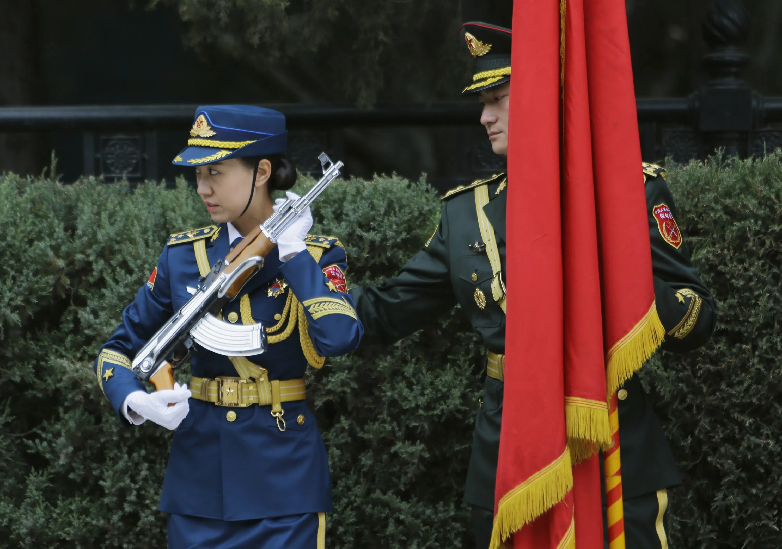 A member of an honour guard adjusts the gun strap of his female compatriot ahead of a welcoming ceremony for Afghanistan's President Ashraf Ghani Ahmadzai outside the Great Hall of the People, in Beijing, October 28, 2014. (Photo by Jason Lee/Reuters)