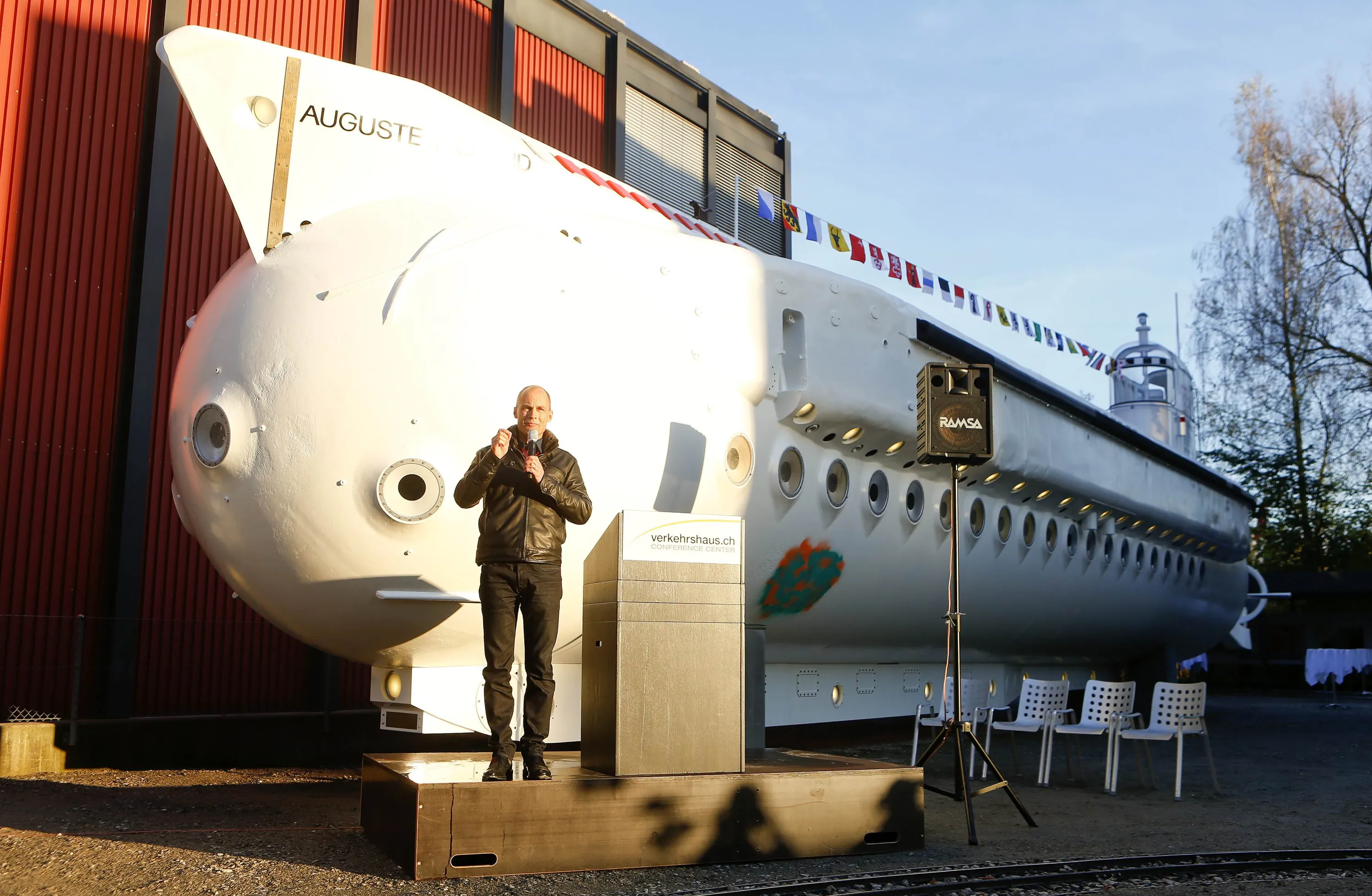 Bertrand Piccard speaks as he stands in front of the submarine Mesoscaphe PX-8 “Auguste Piccard” constructed by his father Jacques Piccard at the Verkehrshaus der Schweiz traffic museum in Luzern October 30, 2014. The PX-8 was the world's first tourist submarine and during the Swiss national fair EXPO 64 in 1964 and 1965 it took 30,000 visitors in 1,100 dives in Lake Geneva to a depth of approximately 100 metres (328 feet). From 1969 to 1984, it was used for scientific and industrial observation dives in the Gulf of Mexico. Today the submarine was presented as a new exhibit of the Verkehrshaus der Schweiz. (Photo by Arnd Wiegmann/Reuters)