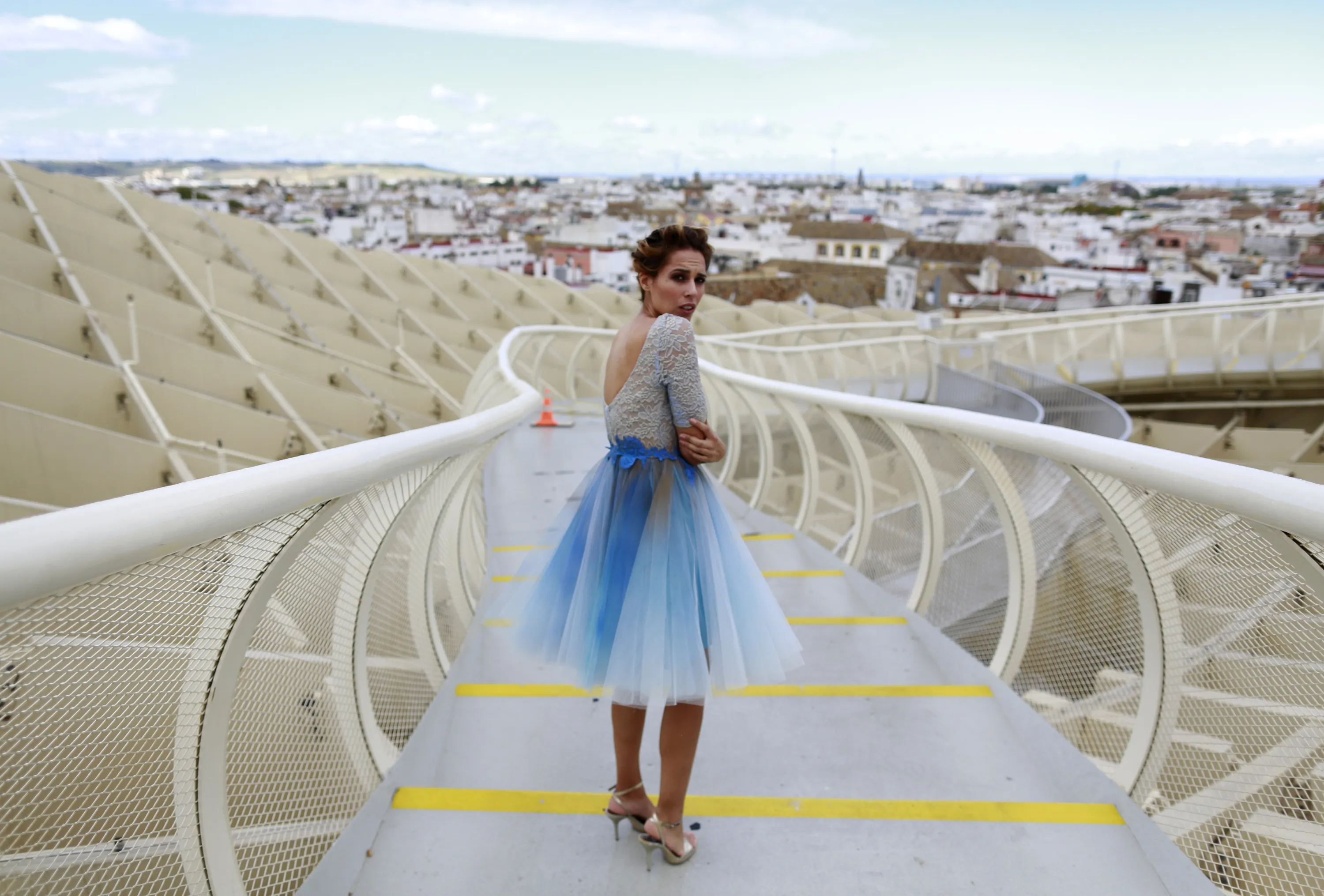 Spanish model, Angela Cristina, 27, stands on the footbridge of the wooden structure Metropol Parasol as she wears a creation by Francisco Tamaral during an urban photo shooting, part of the Andalucia de Moda (Andalusia Fashion) in Seville, southern Spain, November 4, 2014. (Photo by Marcelo del Pozo/Reuters)
