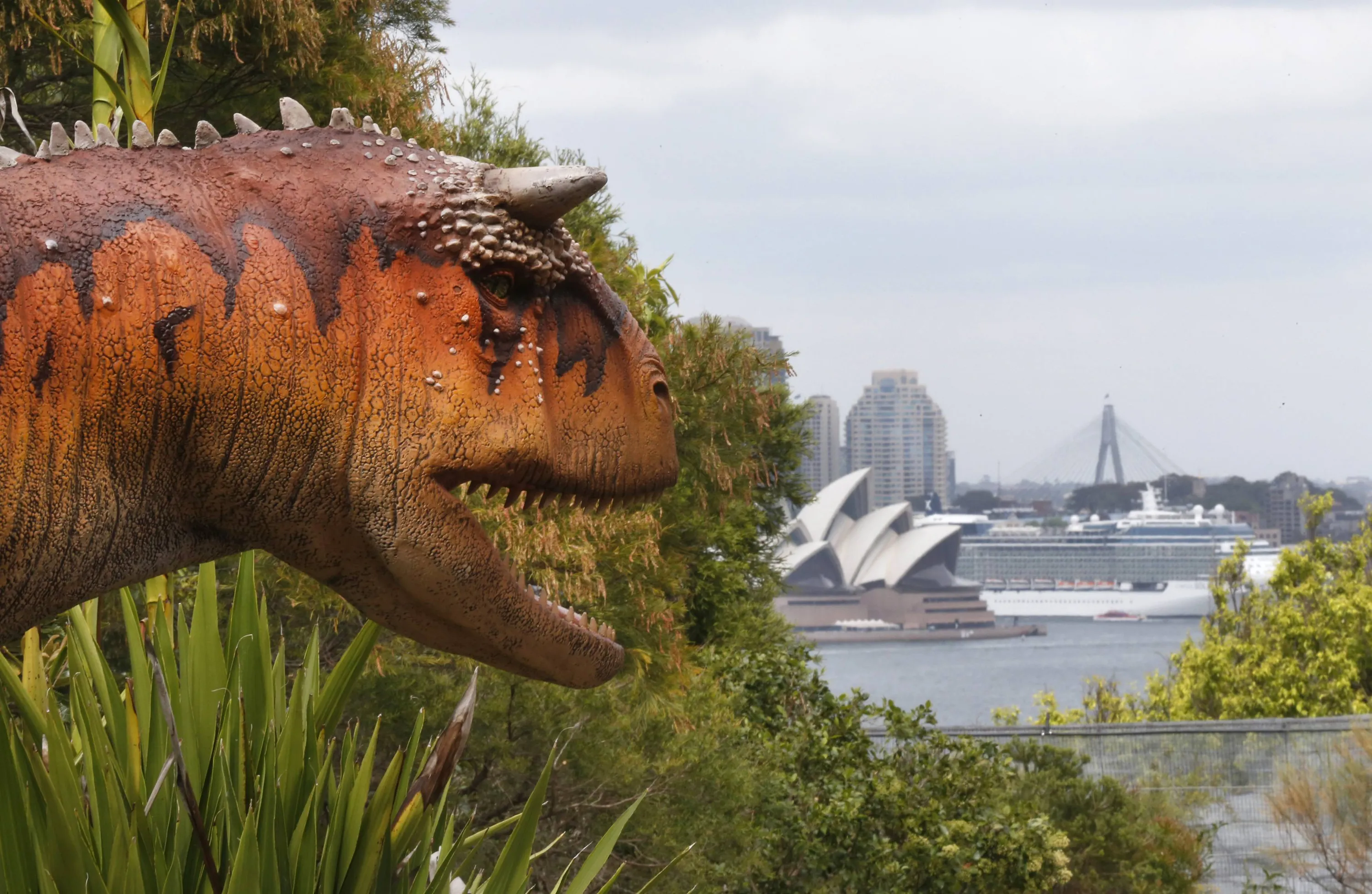 Sydney's Opera House and the cruise ship Celebrity Solstace is pictured alongside a life-size animatronic Carnotaurus dinosaur at Taronga Zoo in Sydney November 4, 2014. Sixteen life-size animatronic dinosaurs which move and produce sound have been put on display at the zoo to teach visitors about extinction and adaptation, as well as bring attention to animals which currently face extinction themselves. (Photo by Jason Reed/Reuters)