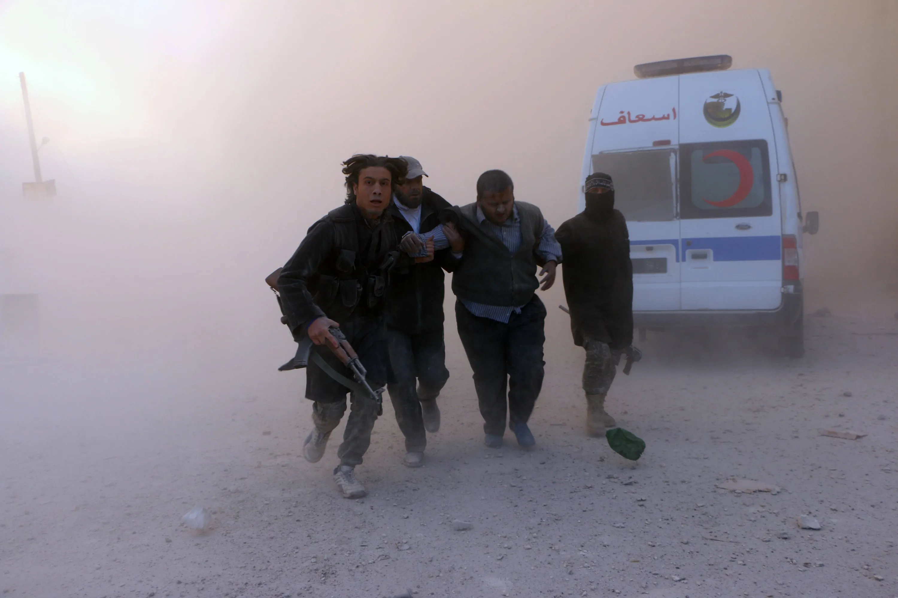 Fighters from the al-Qaida group in the Levant, Al-Nusra Front, help a wounded man following a reported barrel bomb attack by government forces in the Al-Muasalat area in the northern Syrian city of Aleppo on November 6, 2014. Syria has asked Russia to speed up delivery of S-300 anti-aircraft missiles, concerned about a possible US attack, Syrian Foreign Minister Walid Muallem said in an interview published Thursday. (Photo by Fadi Al-Halabi/AFP Photo/AMC)