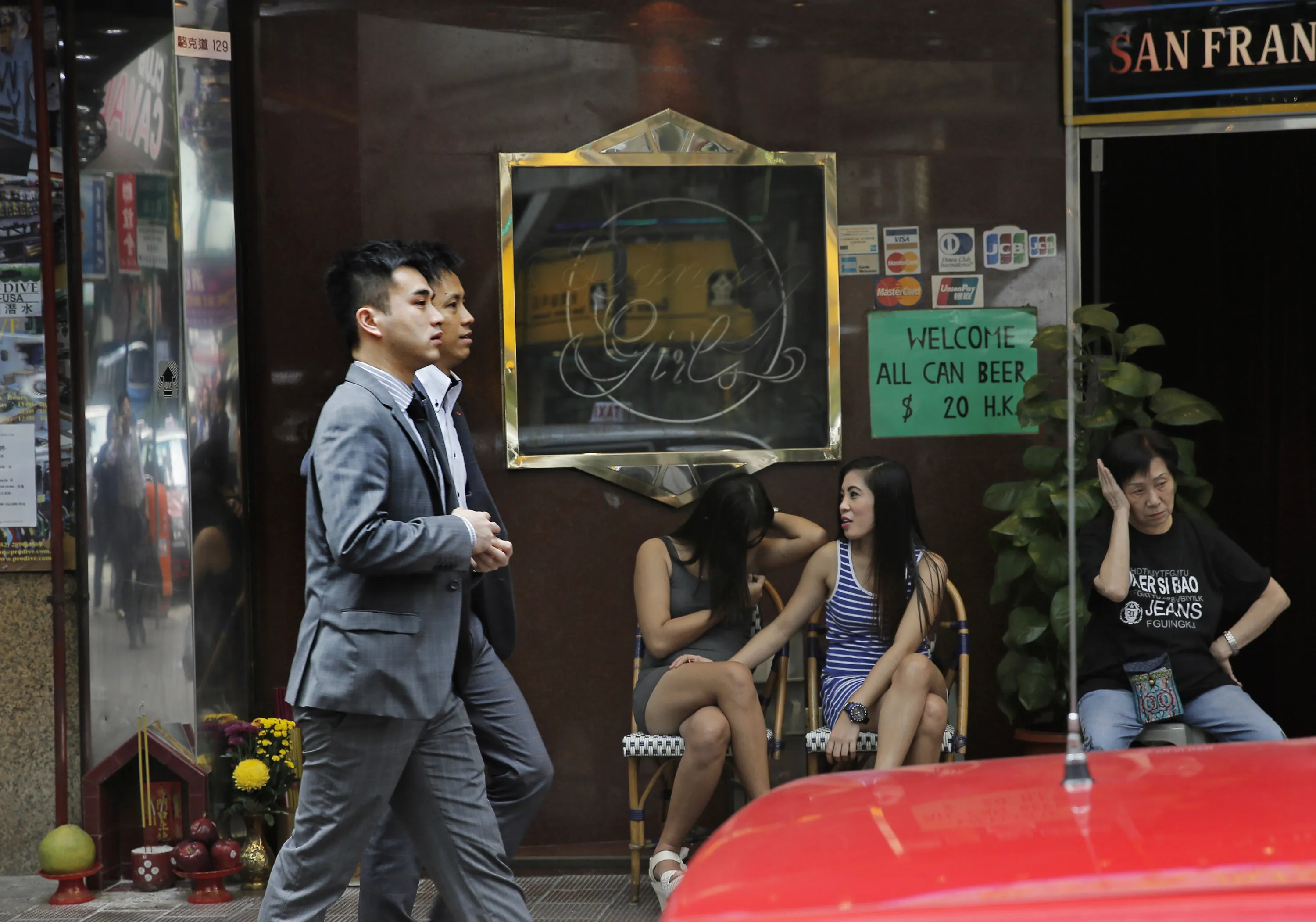 Bar girls sit outside a night club in Hong Kong's Wan Chai district Wednesday, November 5, 2014. For generations of Western men, Hong Kong's Wan Chai neighborhood captured all the mystery and hedonism of this financial capital known around the world as the Pearl of the Orient. Prostitutes, strippers and bar girls entertained visiting sailors and businessmen at all hours in these neon-filled blocks, even as working-class Hong Kongers went about their business in the streets around them. Now, the neighborhood has been jolted by a shocking crime, the gruesome murders of two young Indonesian women, with a British banker the sole suspect. Even as the music and drinks continue flowing in Wan Chai's bars, people said Wednesday that the murders now haunted them and these freewheeling streets. (Photo by Vincent Yu/AP Photo)