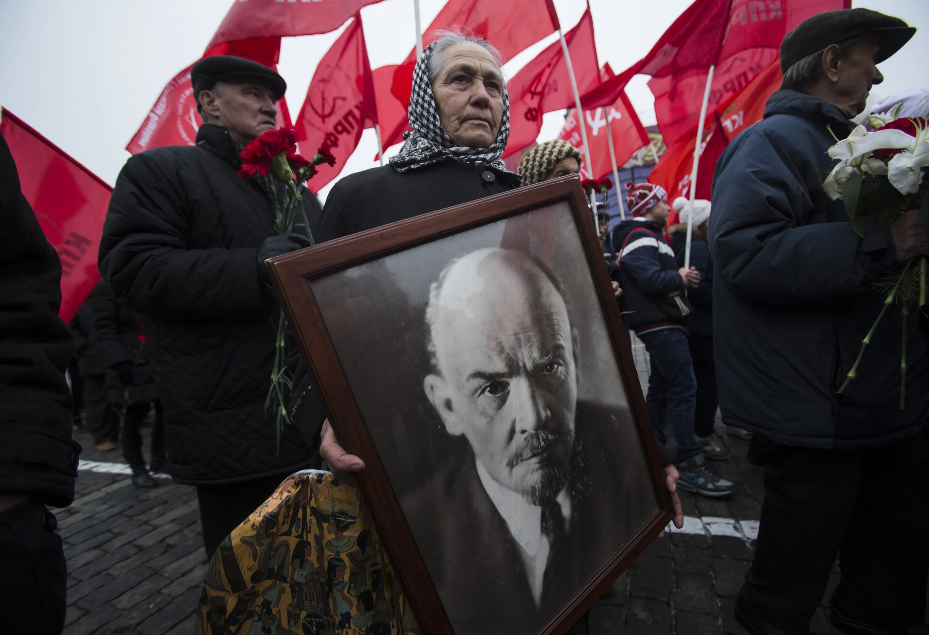 A woman carries a portrait of Lenin as she walks with the Communist Party members and supporters to place flowers at the Tomb of Soviet founder Vladimir Lenin, at Moscow's Red Square on Thursday, November 6, 2014 to mark the anniversary of the November 7, 1917 Bolshevik revolution, which is no longer a public holiday in Russia. (Photo by Pavel Golovkin/AP Photo)
