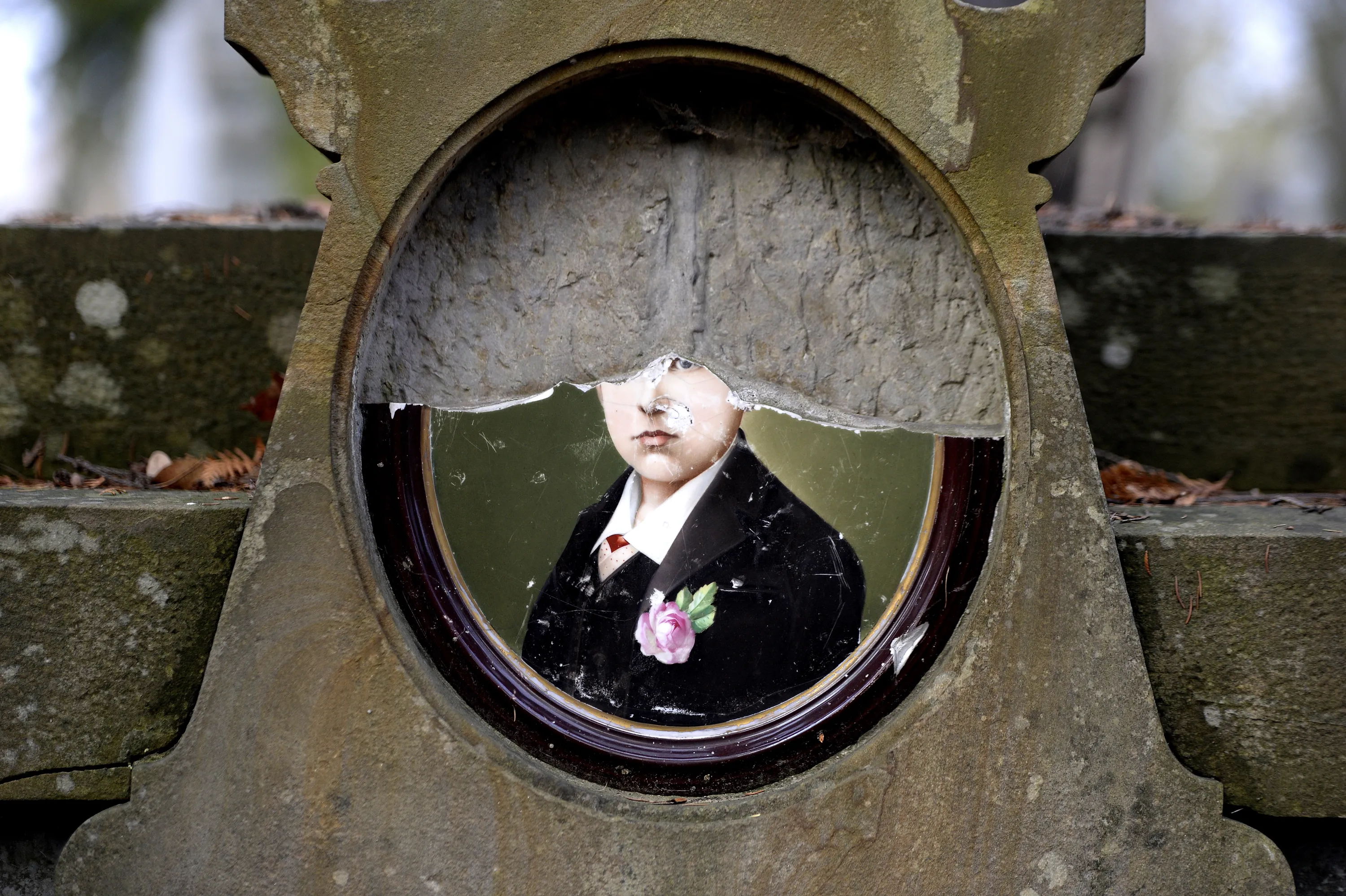 A close-up view of half of a portrait on a Polish grave at the Lychakiv Cemetery in Lviv, Ukraine, November 1, 2014 during All Saints' Day. Created in 1787, The Lychakiv Cemetery is a famous and historic cemetery in Lviv. The original project was prepared by Karol Bauer, the head of the Lviv University botanical garden. (Photo by Darek Delmanowicz/EPA)
