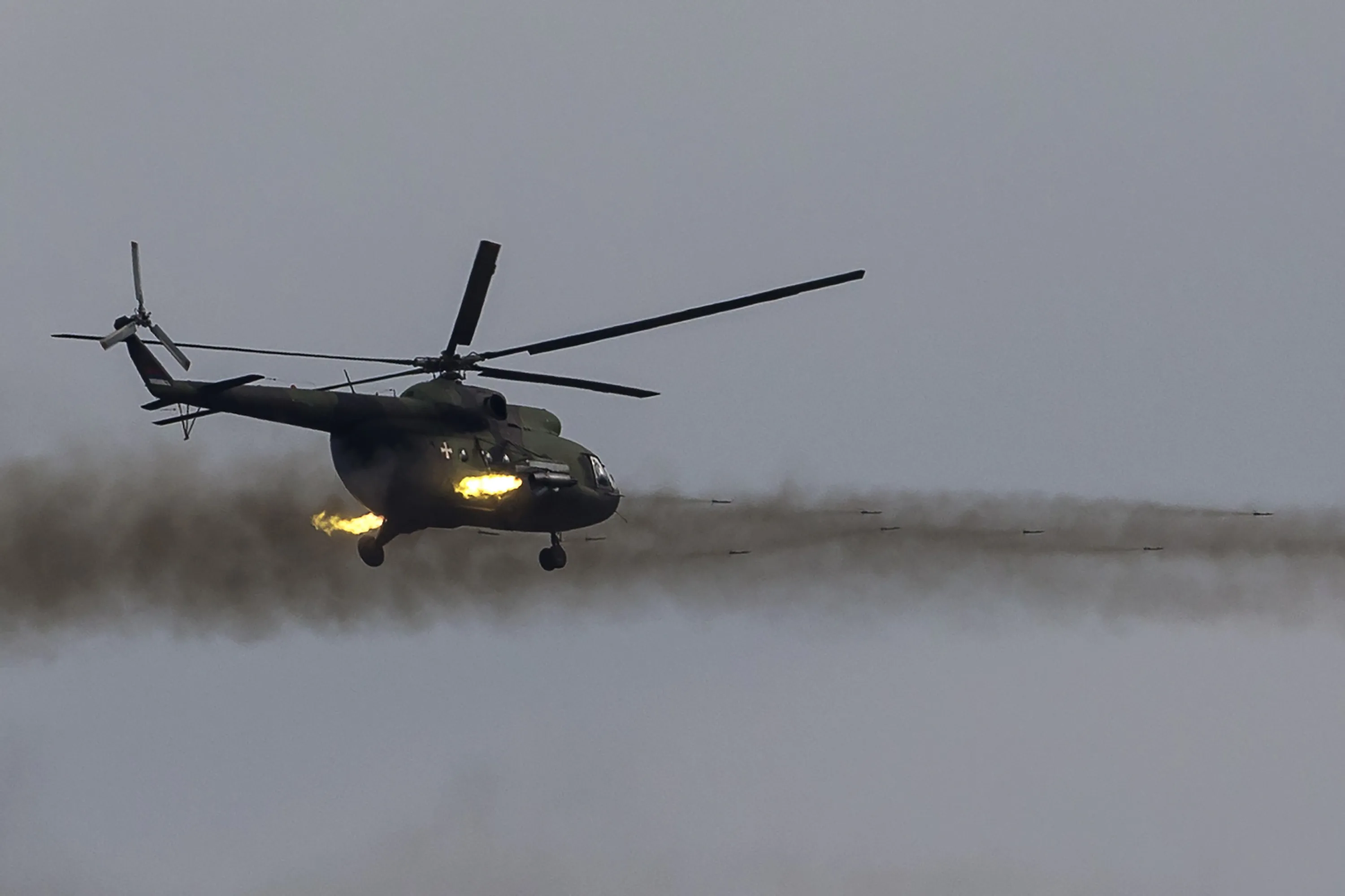 A Serbian Mi-8 helicopter gunship fires unguided rockets on targets during a training exercise in the village of Nikinci, west from Belgrade, November 14, 2014. Russian soldiers parachuted into open fields in western Serbia on Friday as part of an unprecedented joint military drill that has stirred controversy in the European Union candidate-country given the West-Russia standoff over Ukraine. The one-day anti-terrorist exercise, around 50 km (30 miles) from Serbia's border with NATO-member Croatia, illustrated the balancing-act Belgrade faces; safeguarding relations with its big-power ally while pursuing closer integration with Europe at a time of deep West-Russia tension. (Photo by Marko Djurica/Reuters)
