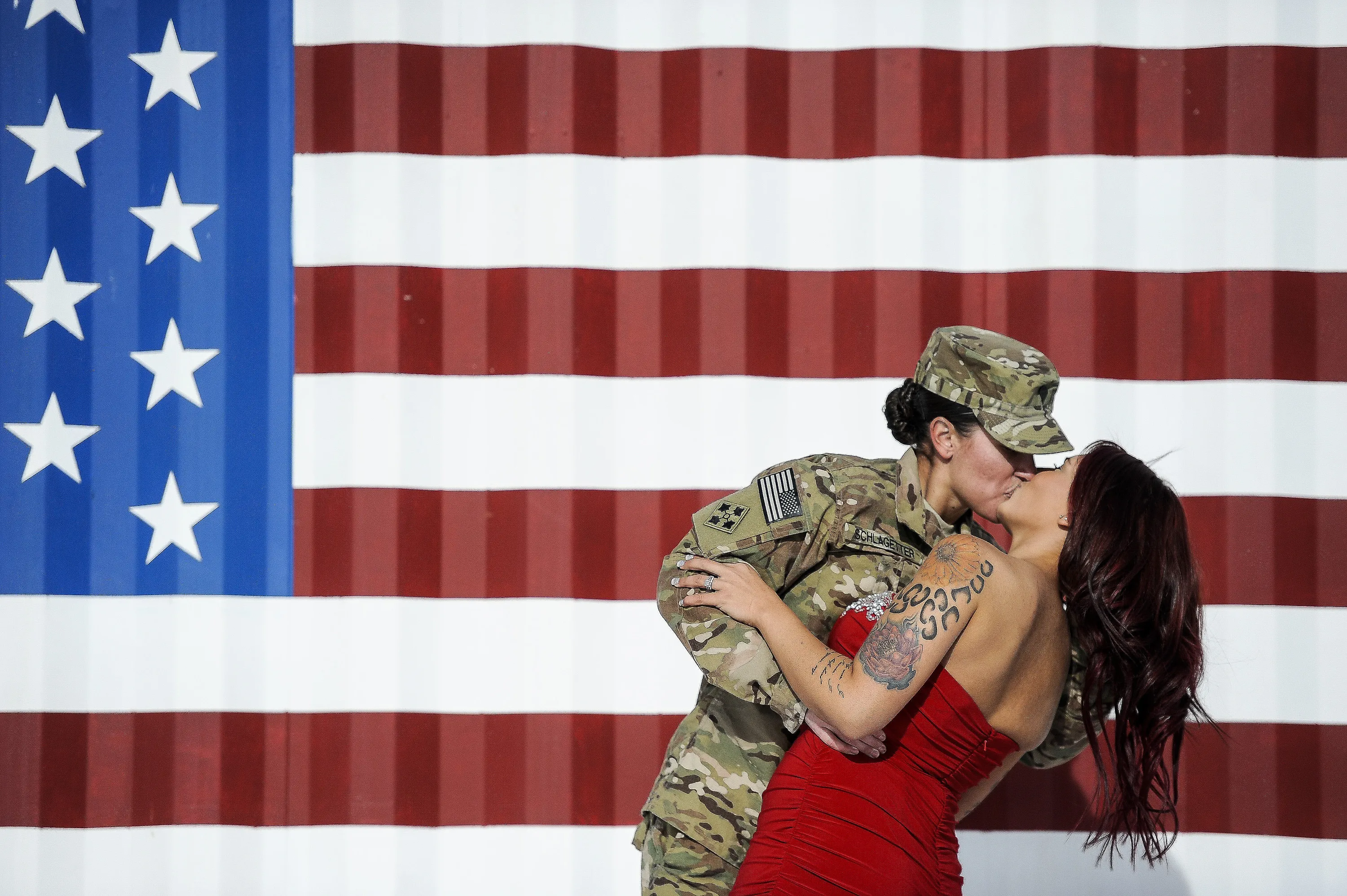 Spc. Sabryna Schlagetter, left, kisses her wife, Cheyenne Schlagetter, after returning home to Fort Carson, Colo., Friday, November 14, 2014, with about 135 members of the 4th Infantry Brigade Combat Team, 4th Infantry Division. Sabryna and Cheyenne married on Valentine's Day this year in New Mexico, nine-months before Sabryna deployed to Afghanistan. (Photo by Michael Ciaglo/AP Photo/The Colorado Springs Gazette)