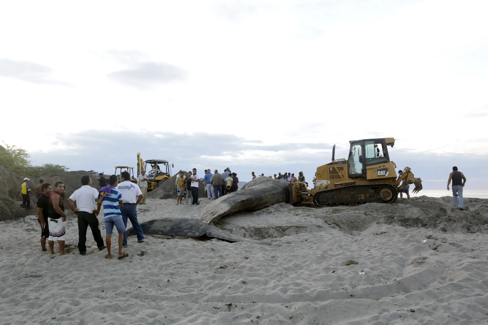 People watch as the body of a beached blue whale is buried at Popoyo beach, at the Nicaraguan pacific coast, November 15, 2014. The blue whale, which beached on Friday in the department of Rivas, has been buried by the authorities after a 12-hour attempt by the army, the police and the Ministry of Environment and Natural Resources (Marena) to return it to sea, according to local media. (Photo by Reuters/Stringer)
