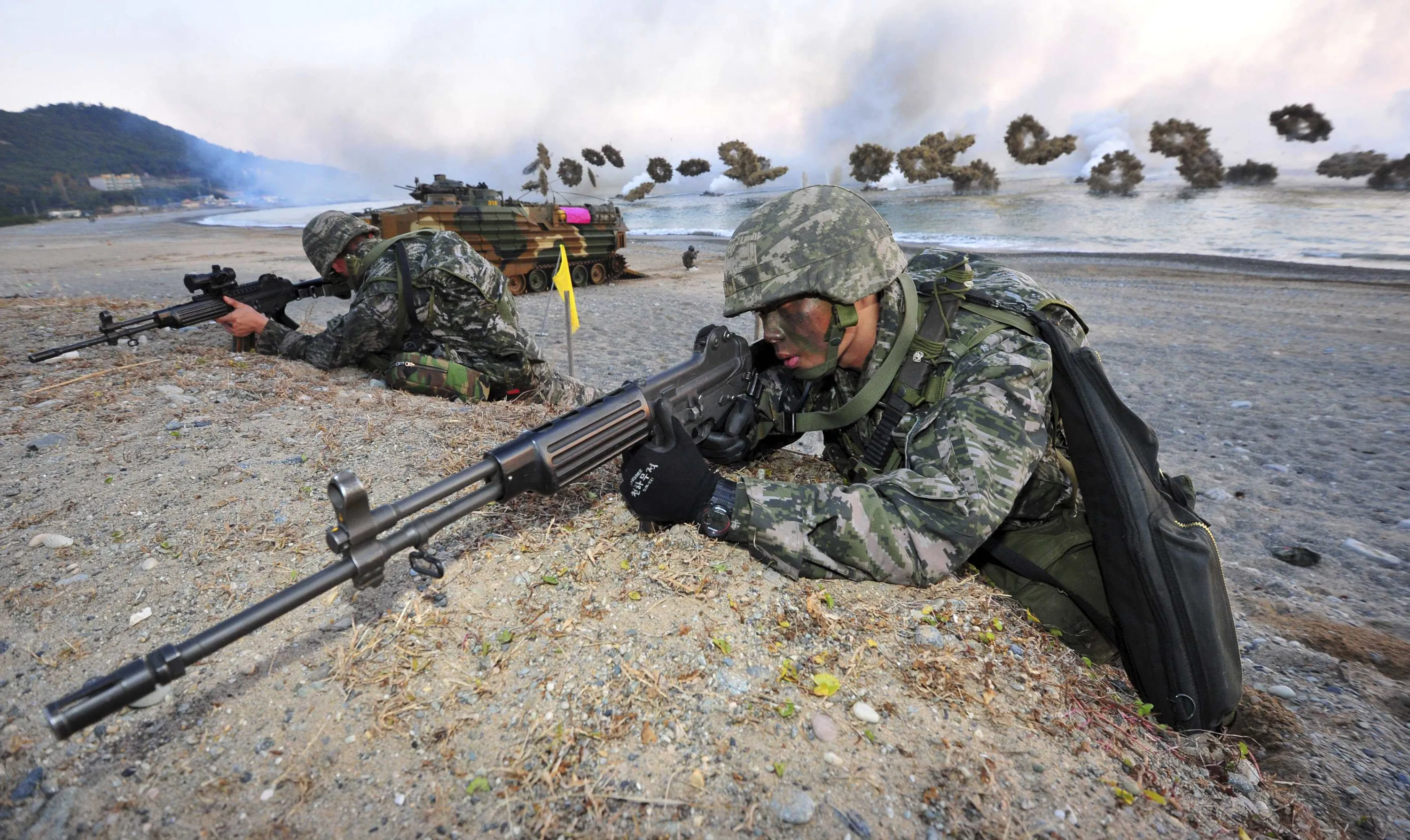 South Korean Marines take part in a landing operation which is a part of annual military exercise “Hokuk”, on a beach in Pohang November 18, 2014. (Photo by Reuters/News1)