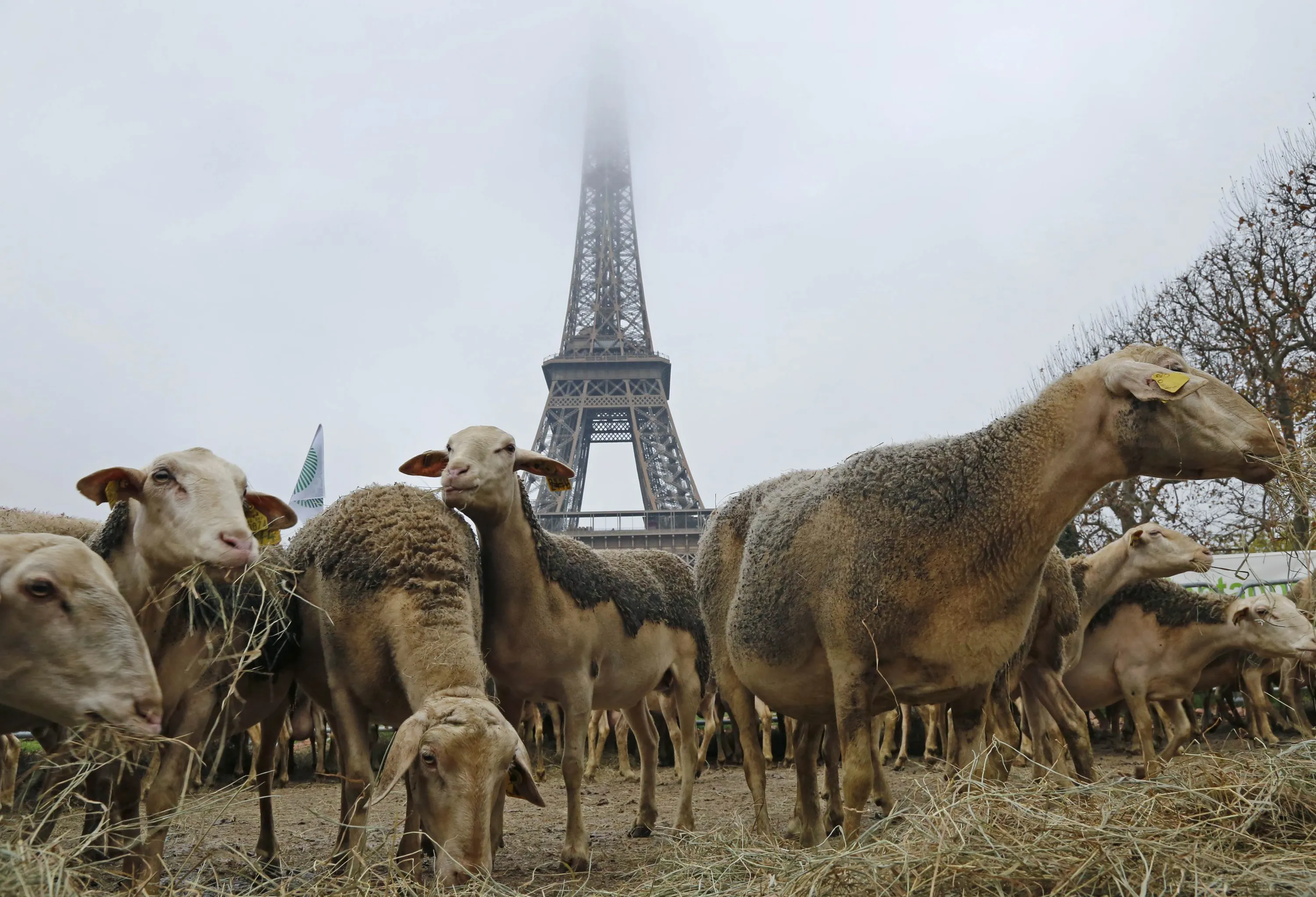 Sheep are gathered in front of the Eiffel tower in Paris during a demonstration of shepherds against the protection of wolves in France November 27, 2014. French shepherds, with around 250 sheep, staged a protest in central Paris against the French government's Plan Loup (wolf plan), introduced to try to pacify shepherds and protect wolves, ahead a meeting with French Agriculture minister. (Photo by Jacky Naegelen/Reuters)