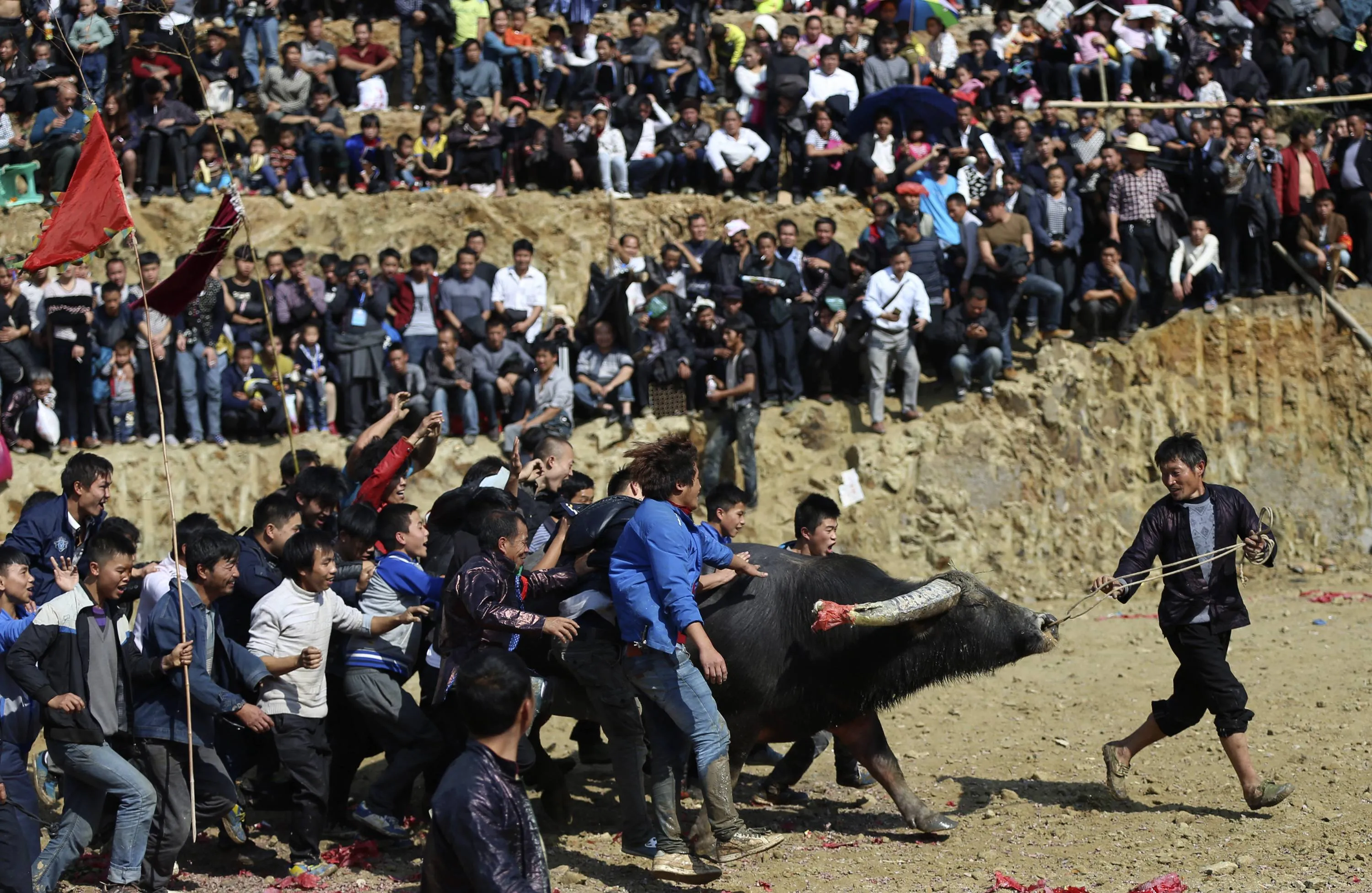 People celebrate with the winning bull after an ethnic Dong traditional bullfighting contest in Congjiang county, Guizhou province, November 29, 2014. (Photo by Sheng Li/Reuters)