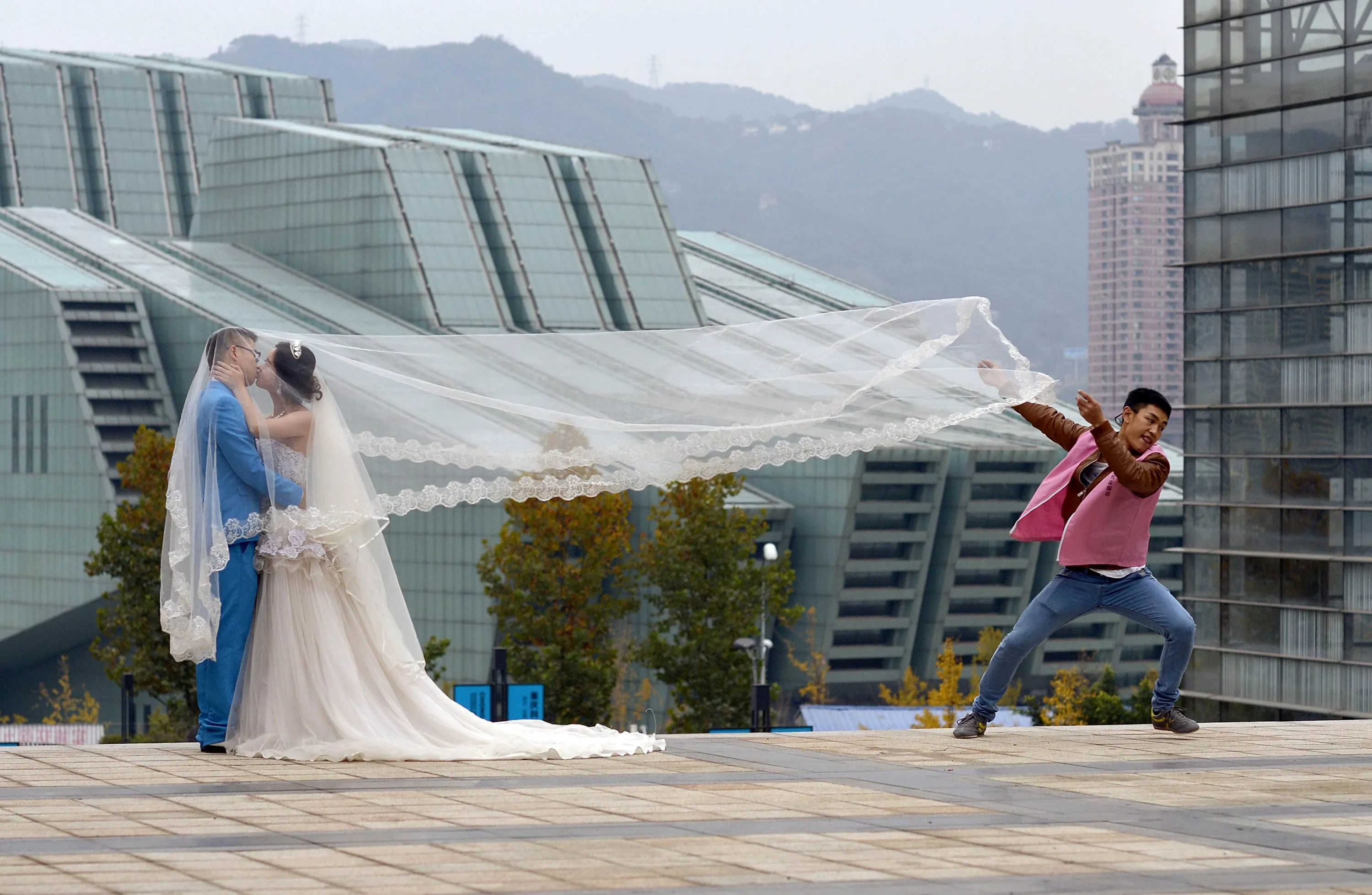 A newlywed couple kiss during a photo shoot, as an assistant runs away after lifting the veil, in Chongqing municipality, December 1, 2014. (Photo by Reuters/Stringer)