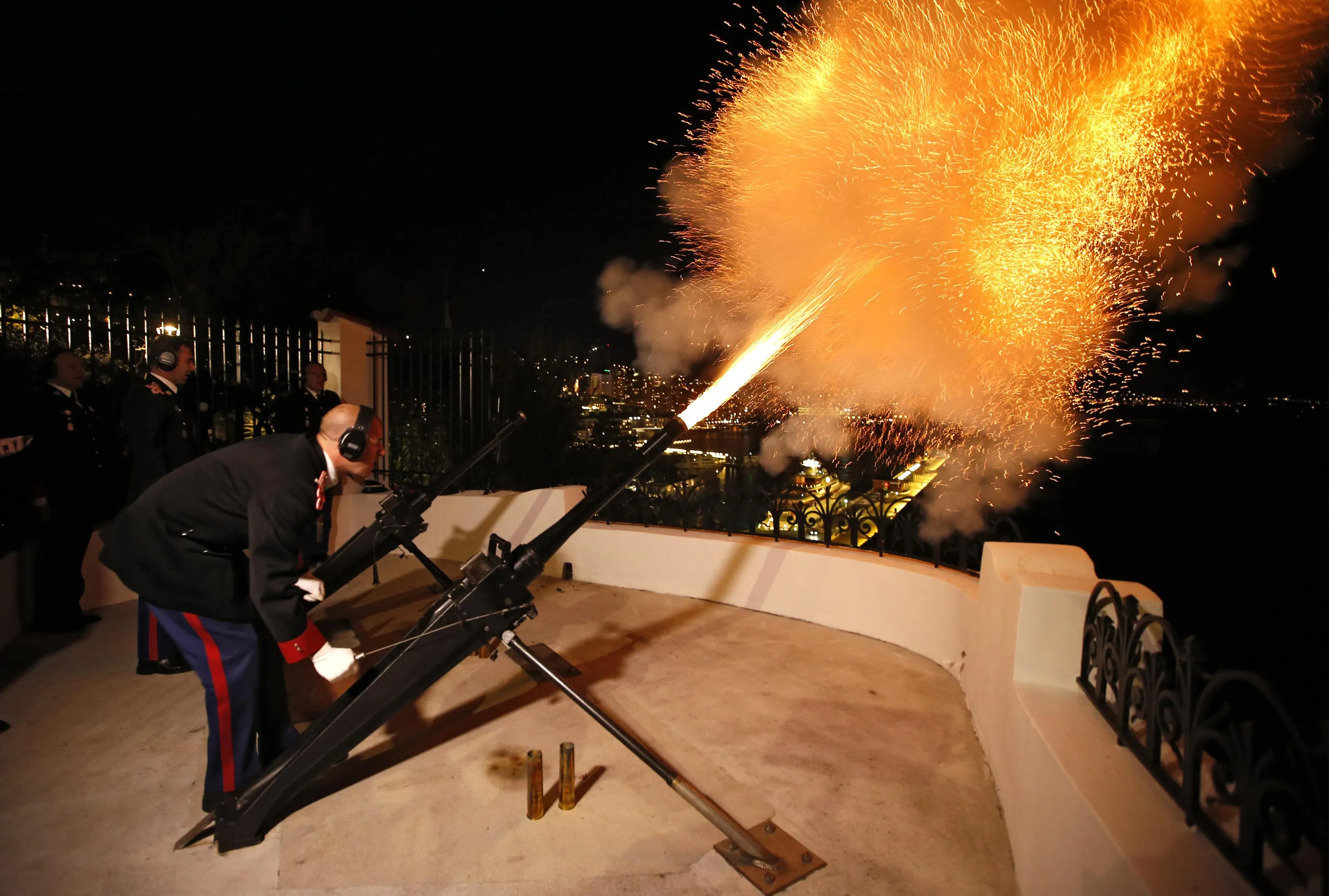 Carabiniers of Monaco's Prince Albert II fire canons to announce the birth of twins of Prince Albert II of Monoco and Charlene, in front of the Monaco Palace December 10, 2014. Princess Charlene of Monaco gave birth on Wednesday to a boy and a girl, the royal couple's first children, an aide to the royals said. According to Monaco's Constitution the boy, named Jacques, will be first-in-line to the throne, and not his twin sister, Gabriella. (Photo by Eric Gaillard/Reuters)