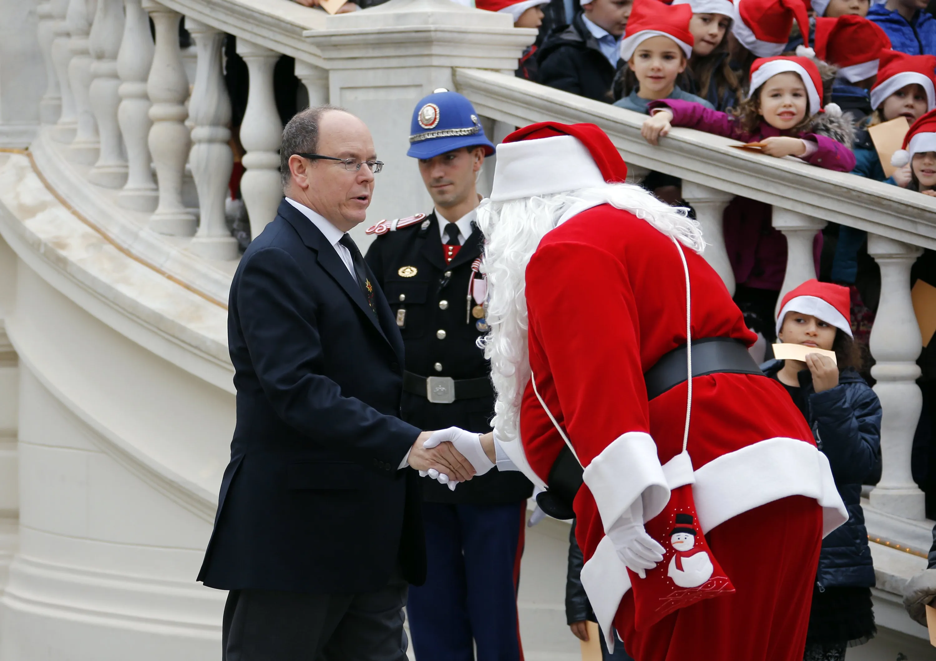 A man dressed as a Santa Claus greets Prince Albert II of Monaco (L) as he arrives to attend the traditional Christmas tree ceremony at the Monaco Palace as part of Christmas holiday season in Monaco, December 17, 2014. (Photo by Eric Gaillard/Reuters)