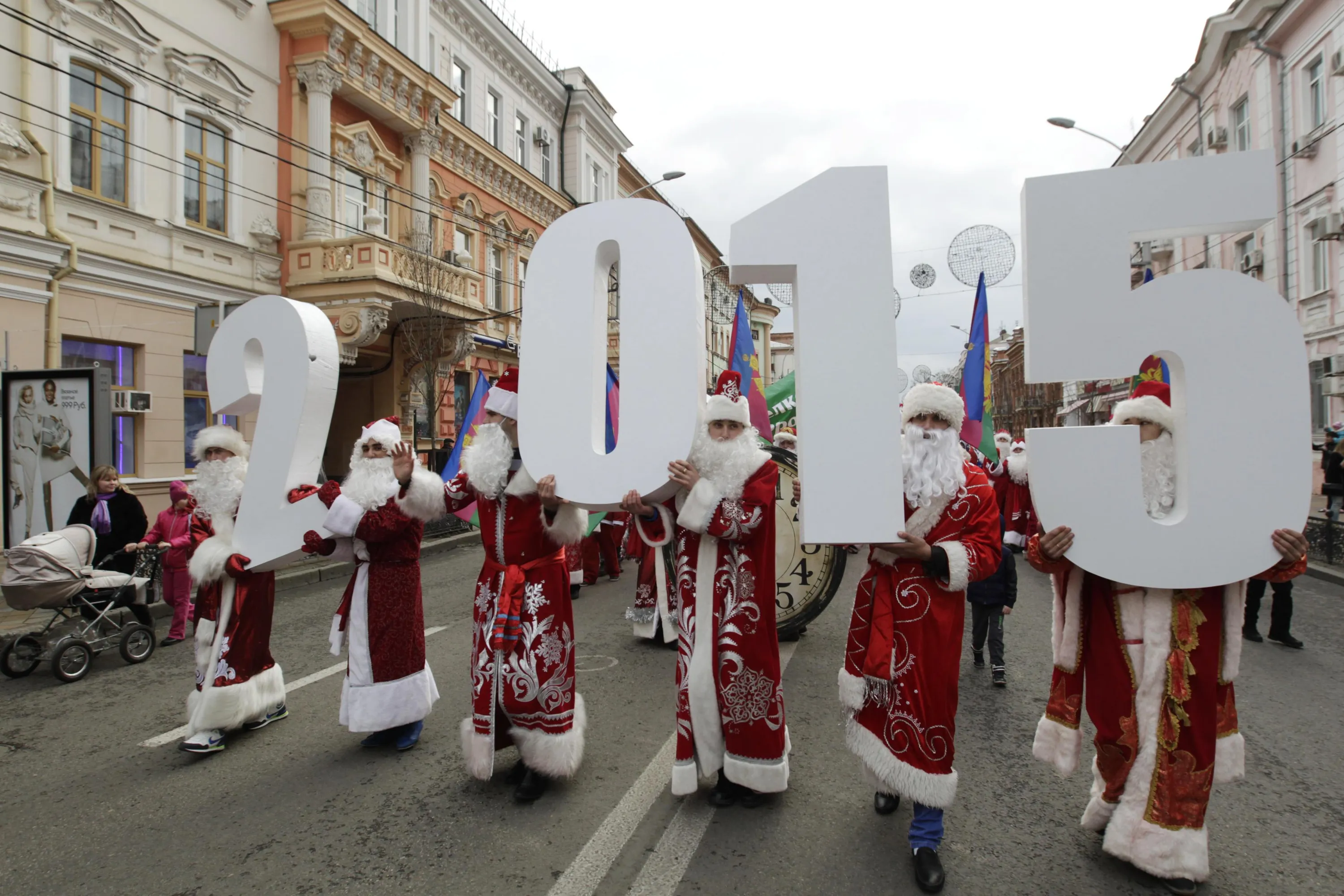 People dressed as Father Frost, the equivalent of Santa Claus, carry figures that make up the number 2015 during a parade in the Russian southern city of Krasnodar December 20, 2014. (Photo by Eduard Korniyenko/Reuters)