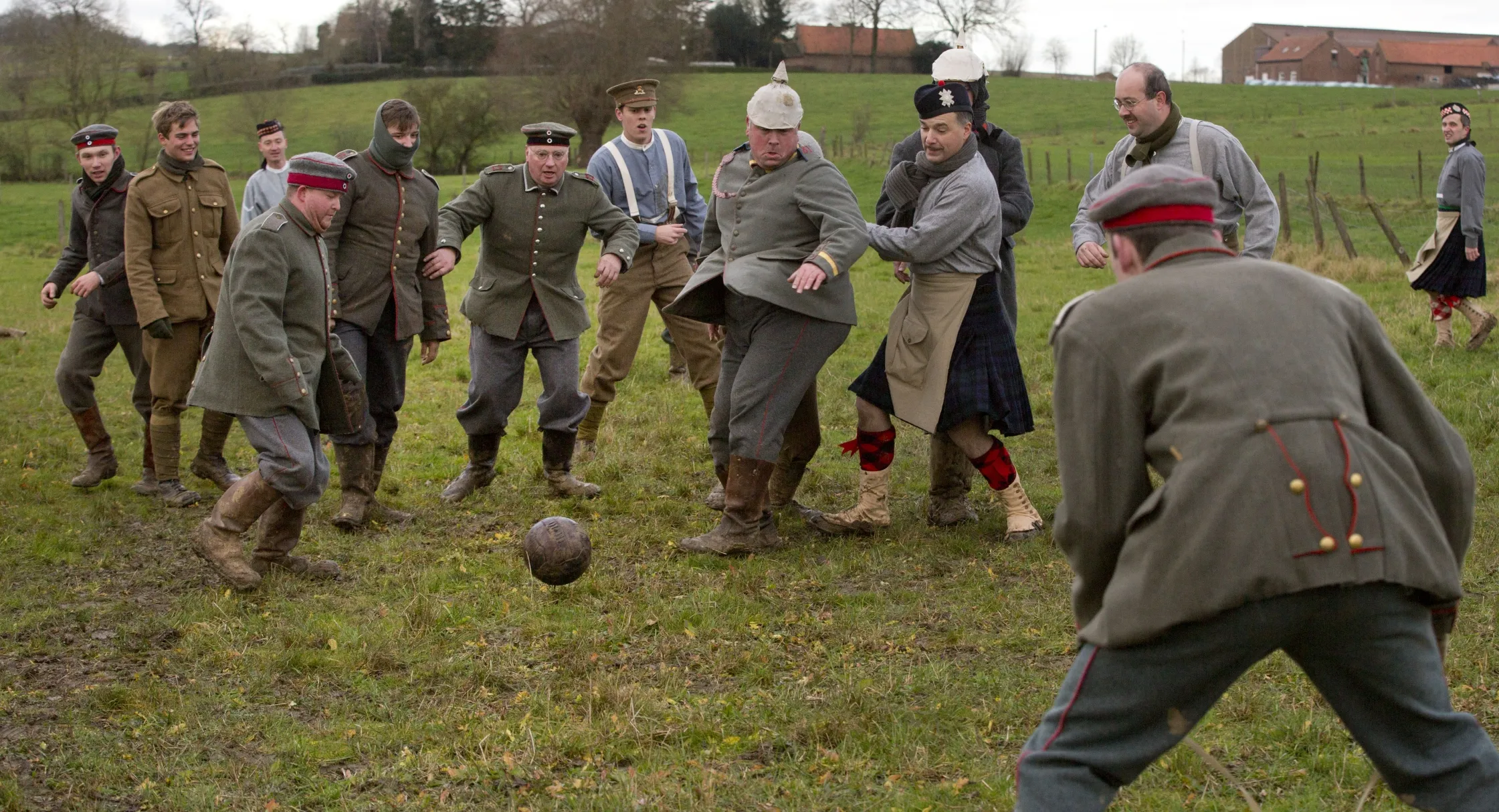 Re-enactors, from various living history groups, are dressed in World War I British and German uniforms as they kick around a soccer ball during a re-enactment of the 1914 Christmas Truce in Ploegsteert, Belgium on Saturday, December 20, 2014. During that first Christmas Day in World War I, something magical happened. Soldiers who had been killing each other by the tens of thousands for months climbed out of their muddy trenches to seek a shred of humanity amid the horrors of war. Hands reached out across the narrow divide, presents were exchanged, and in Flanders Fields a century ago, a spontaneous Christmas truce briefly lifted the human spirit. (Photo by Virginia Mayo/AP Photo)