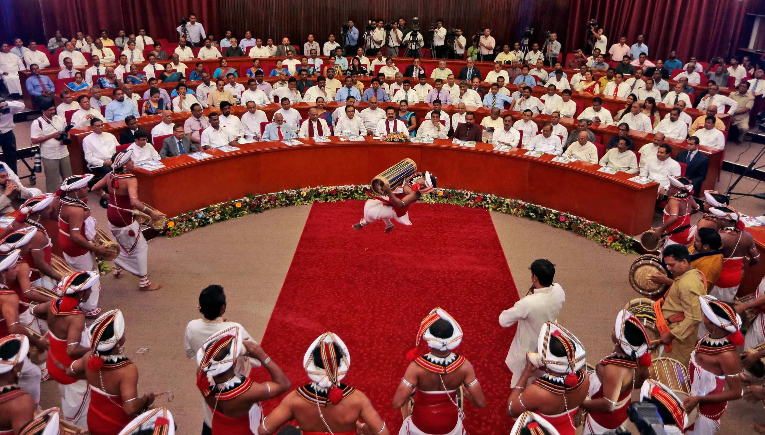 Sri Lankan President Mahinda Rajapaksa, center in front row, watches traditional dancers perform during the launch of his election manifesto in Colombo, Sri Lanka, Tuesday, December 23, 2014. Rajapaksa will face his former health minister Maithripala Sirisena in the January 8 presidential elections. (Photo by Eranga Jayawardena/AP Photo)