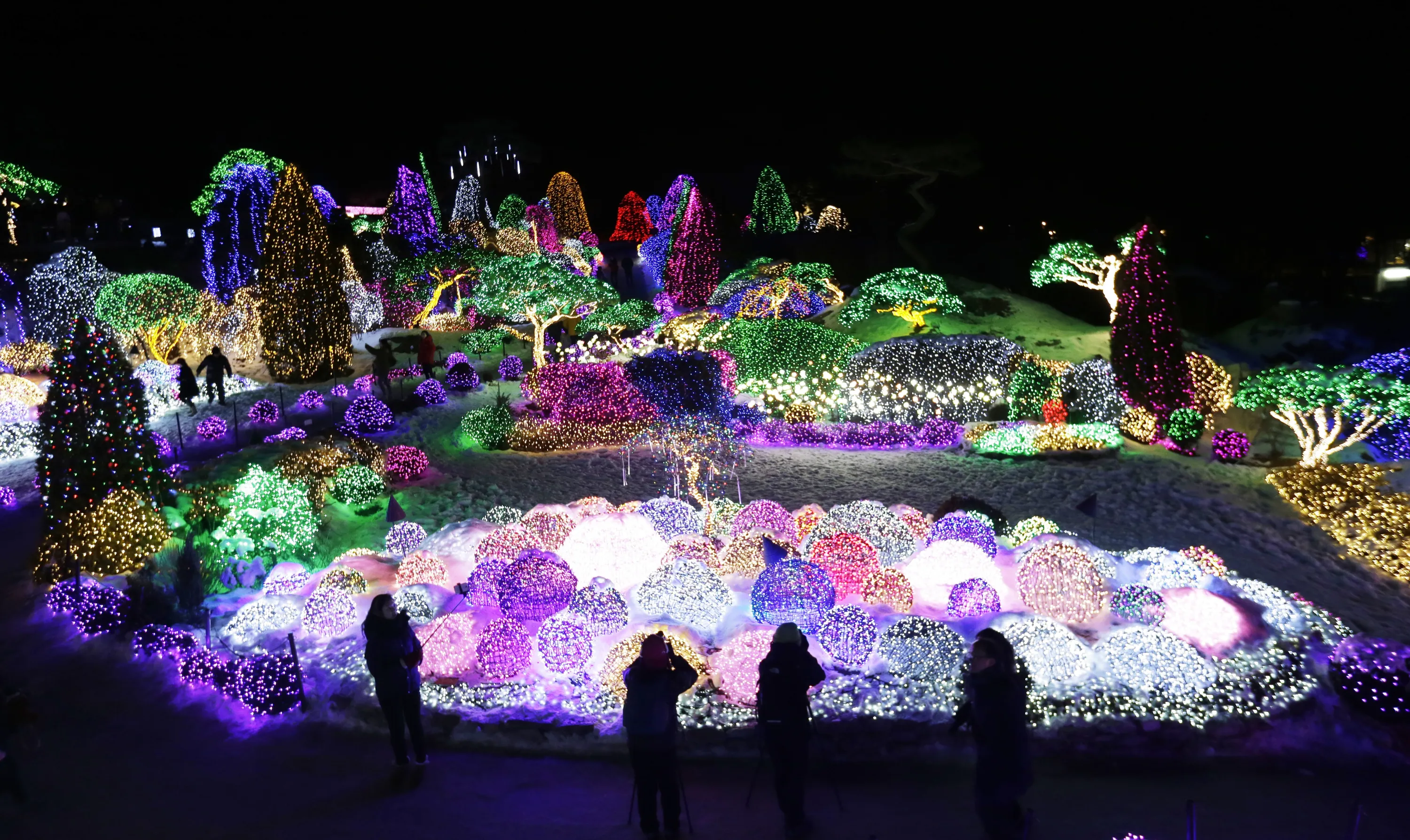 Visitors are silhouetted with decorated lights on trees to celebrate the upcoming Christmas and New Year at Garden of Morning Calm in Gapyeong, South Korea, Monday, December 22, 2014. Christmas is one of the biggest holidays in South Korea. (Photo by Ahn Young-joon/AP Photo)