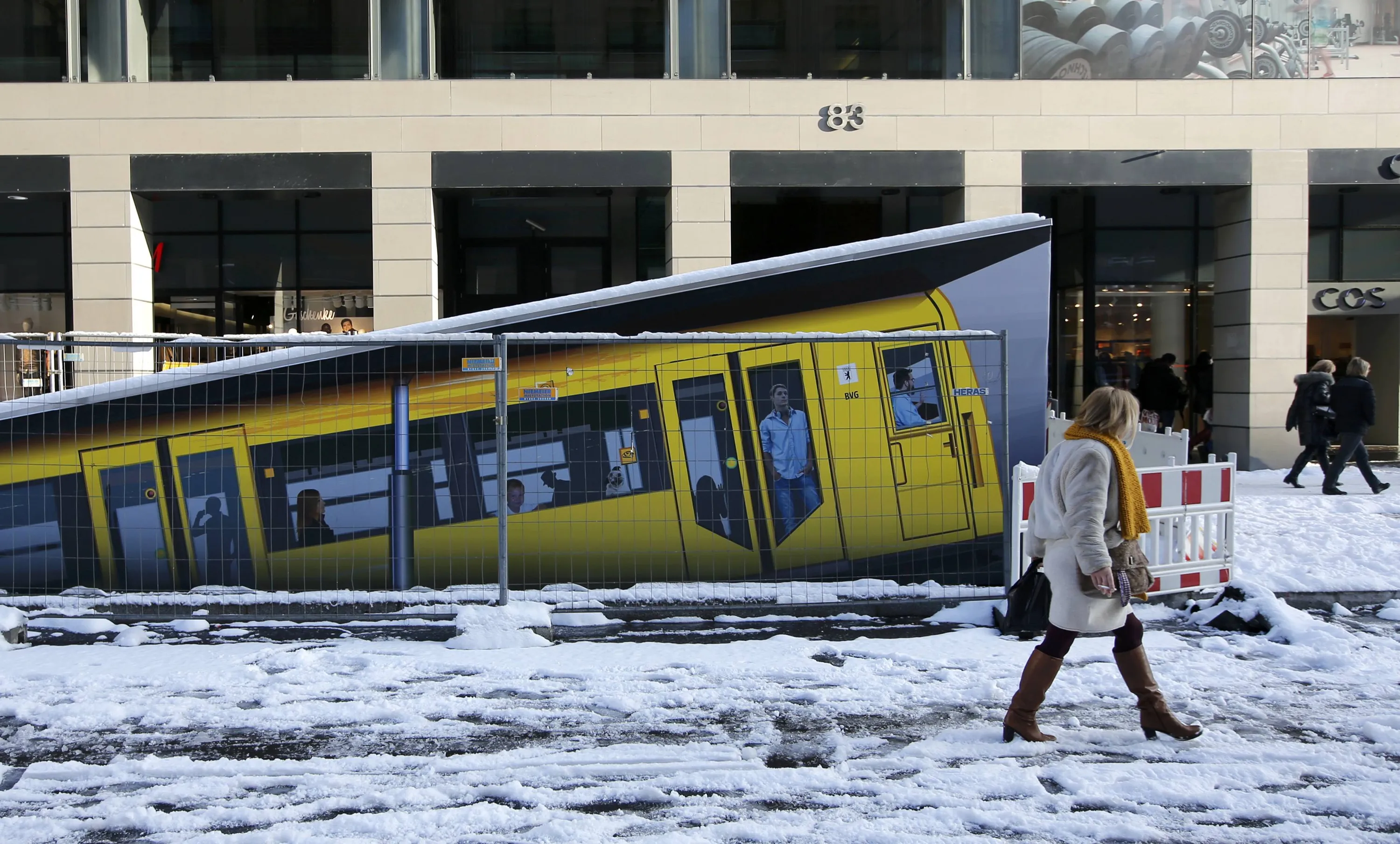 People walk beside a painted U-Bahn underground train marking an entrance of the new Unter den Linden underground station currently under construction in Berlin, December 29, 2014. (Photo by Fabrizio Bensch/Reuters)